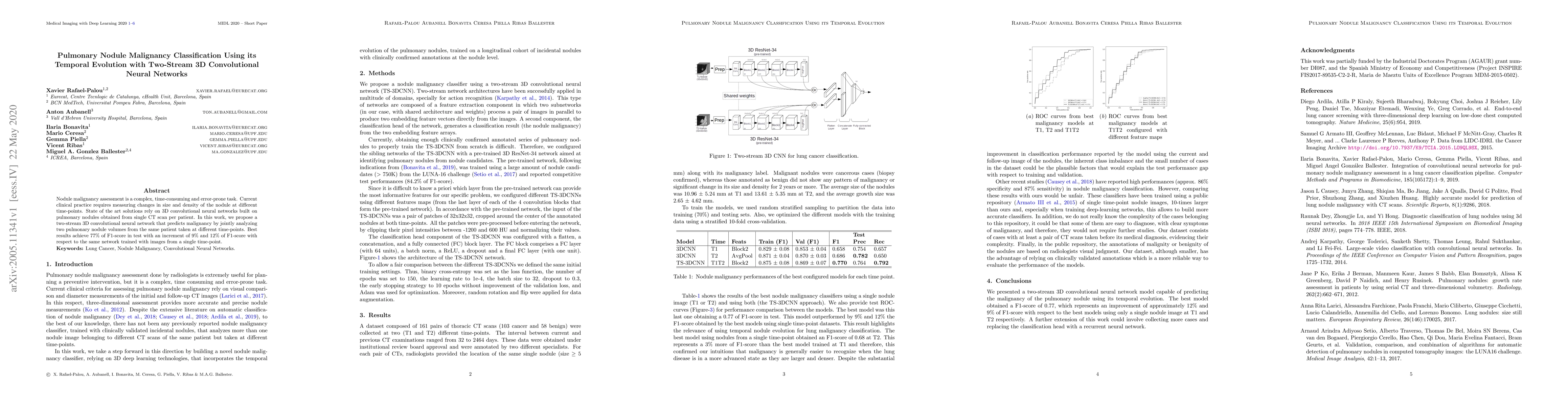 This paper proposes a two-stream 3D convolutional neural network to classify pulmonary nodule malignancy by analyzing nodule volumes from two different time-points, achieving a 77% F1-score and outperforming single-timepoint models by 9% and 12% in F1-score.