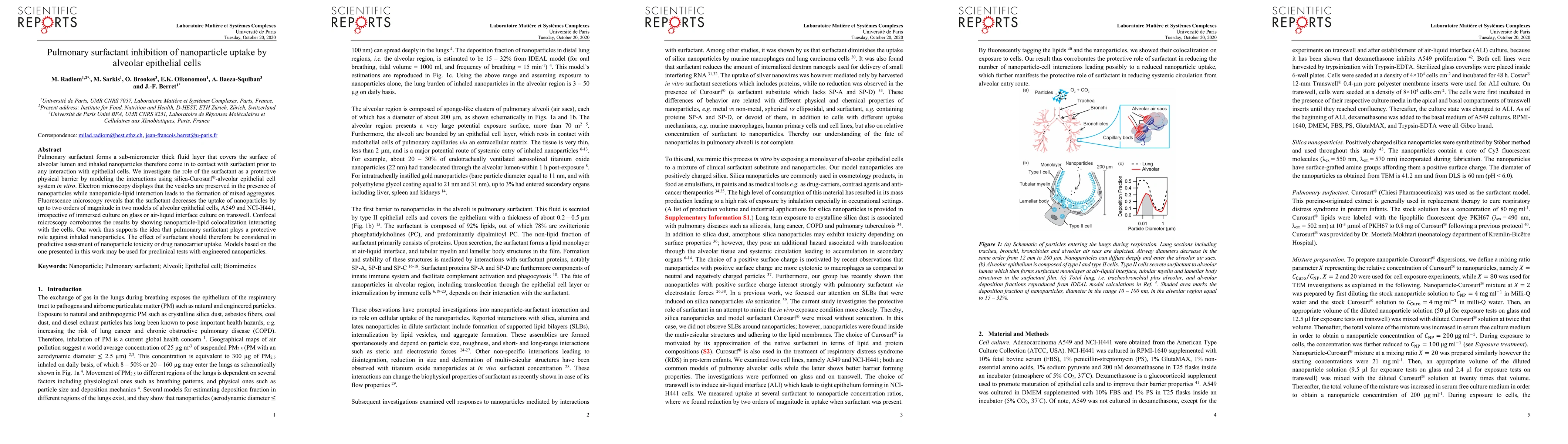 This study investigates the role of pulmonary surfactant as a protective barrier against inhaled nanoparticles, demonstrating that surfactant significantly reduces nanoparticle uptake by alveolar epithelial cells in vitro. The findings suggest that surfactant should be considered in assessments of nanoparticle toxicity and drug delivery.