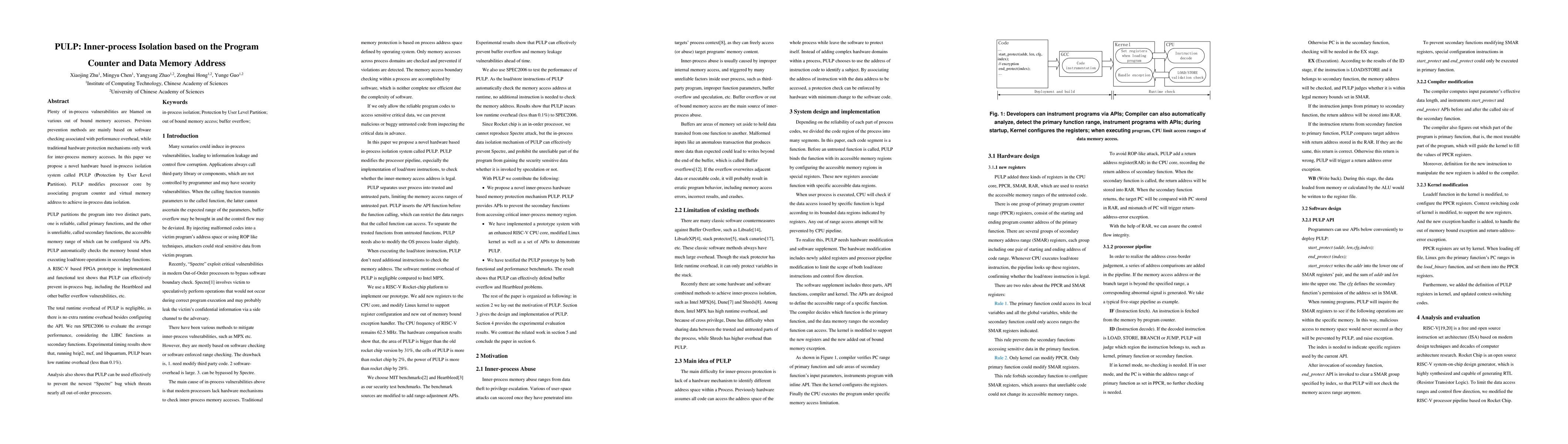 The paper introduces PULP, a hardware-based in-process isolation system that prevents in-process vulnerabilities like Heartbleed and buffer overflows by partitioning a program into reliable and unreliable parts, with memory access configured via APIs. A RISC-V FPGA prototype demonstrated negligible runtime overhead (less than 0.1% for SPEC2006 benchmarks) and effectiveness against Spectre-like bugs.