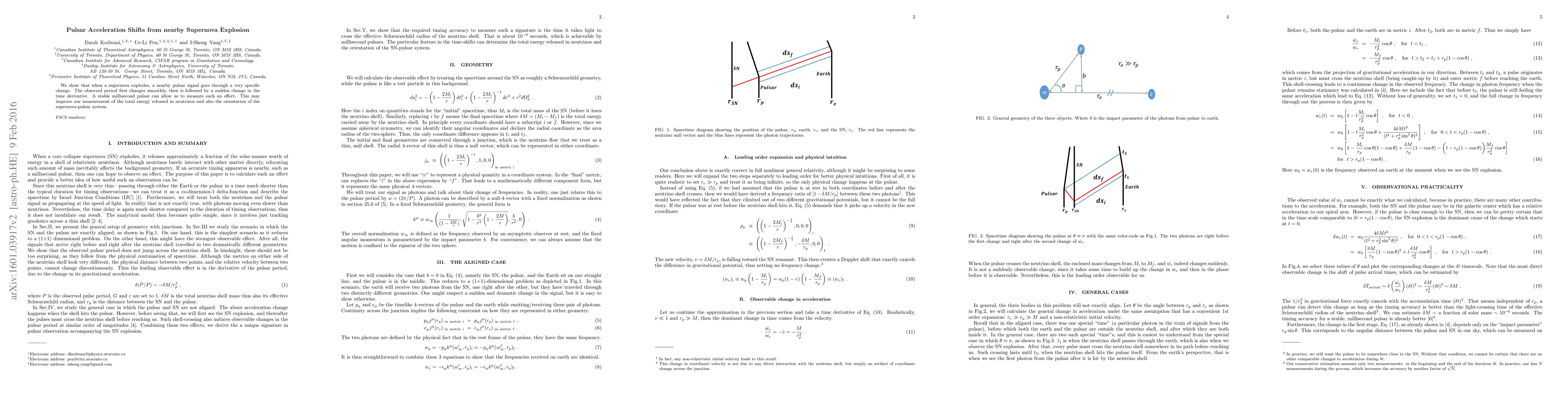 A nearby supernova explosion causes a nearby pulsar signal to change its period smoothly, followed by a sudden change in the time derivative, which can help measure energy released and orientation of the system.