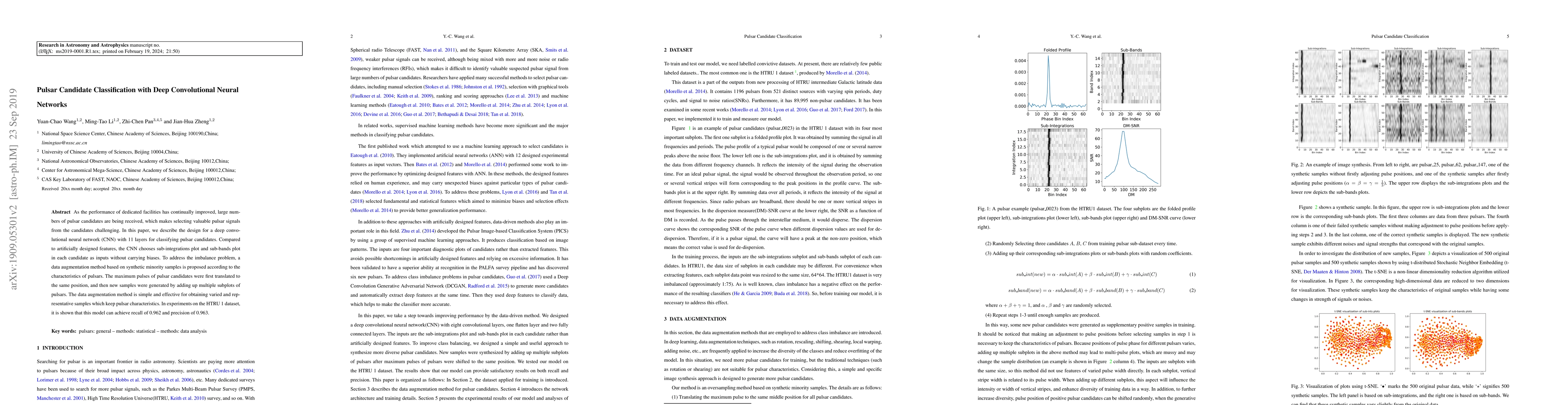 This paper proposes an 11-layer deep convolutional neural network (CNN) for classifying pulsar candidates, using sub-integrations and sub-bands plots as inputs. To tackle data imbalance, a synthetic minority sample augmentation method is introduced, generating varied samples by combining multiple pulsar subplots. The model achieves a recall of 0.962 and precision of 0.963 on the HTRU 1 dataset.