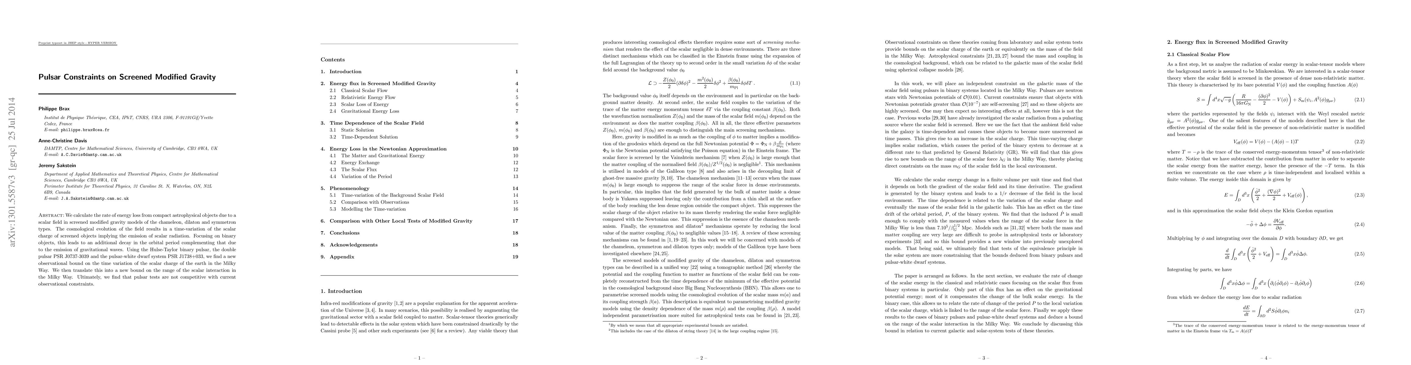 This paper investigates the energy loss from compact binary objects due to scalar fields in screened modified gravity models, deriving new observational bounds on the time variation of the scalar charge and the range of scalar interactions. Despite finding constraints from pulsar systems, the study concludes that pulsar tests are not as stringent as current observational limits.