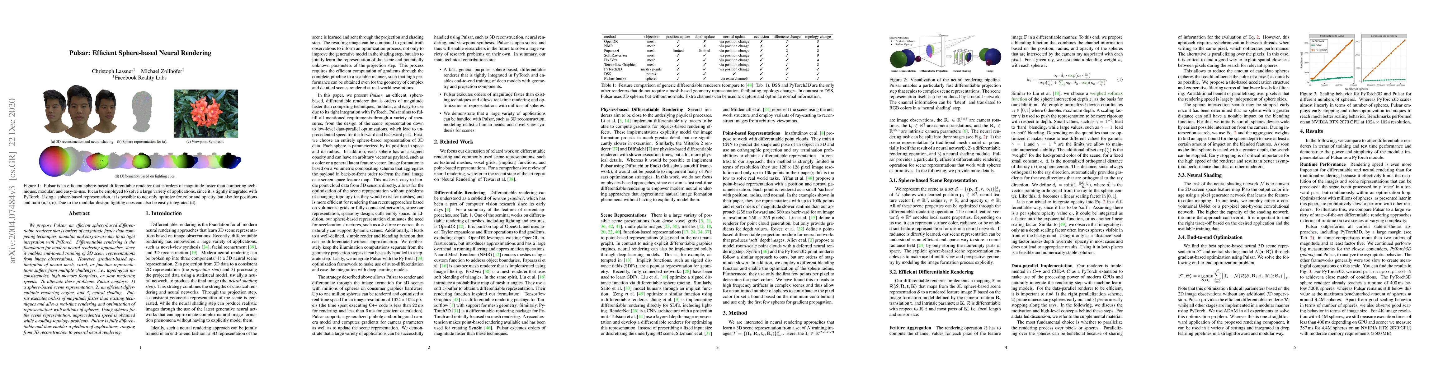 Pulsar is an efficient, sphere-based differentiable renderer that significantly outperforms existing techniques in speed and memory efficiency. It leverages a sphere-based representation and neural shading to enable real-time rendering and optimization of 3D scene representations.