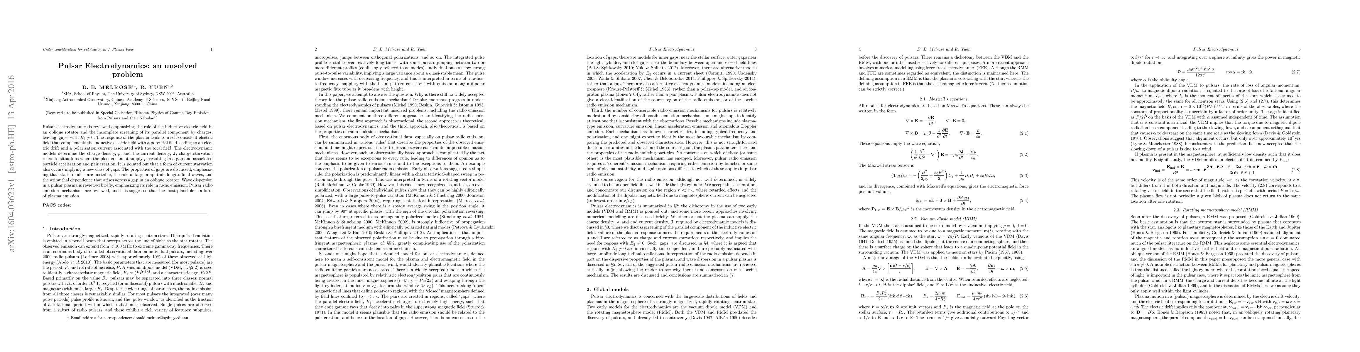 Pulsar electrodynamics is reviewed emphasizing the role of the inductive electric field in an oblique rotator and the incomplete screening of its parallel component by charges, leaving `gaps' with $E_\parallel\ne0$. The response of the plasma leads to a self-consistent electric field that complements the inductive electric field with a potential field leading to an electric drift and a polarization current associated with the total field. The electrodynamic models determine the charge density, $\rho$, and the current density, ${\bf J}$, charge starvation refers to situations where the plasma cannot supply $\rho$, resulting in a gap and associated particle acceleration and pair creation. It is pointed out that a form of current starvation also occurs implying a new class of gaps. The properties of gaps are discussed, emphasizing that static models are unstable, the role of large-amplitude longitudinal waves, and the azimuthal dependence that arises across a gap in an oblique rotator. Wave dispersion in a pulsar plasma is reviewed briefly, emphasizing its role in radio emission. Pulsar radio emission mechanisms are reviewed, and it is suggested that the most plausible is a form of plasma emission.