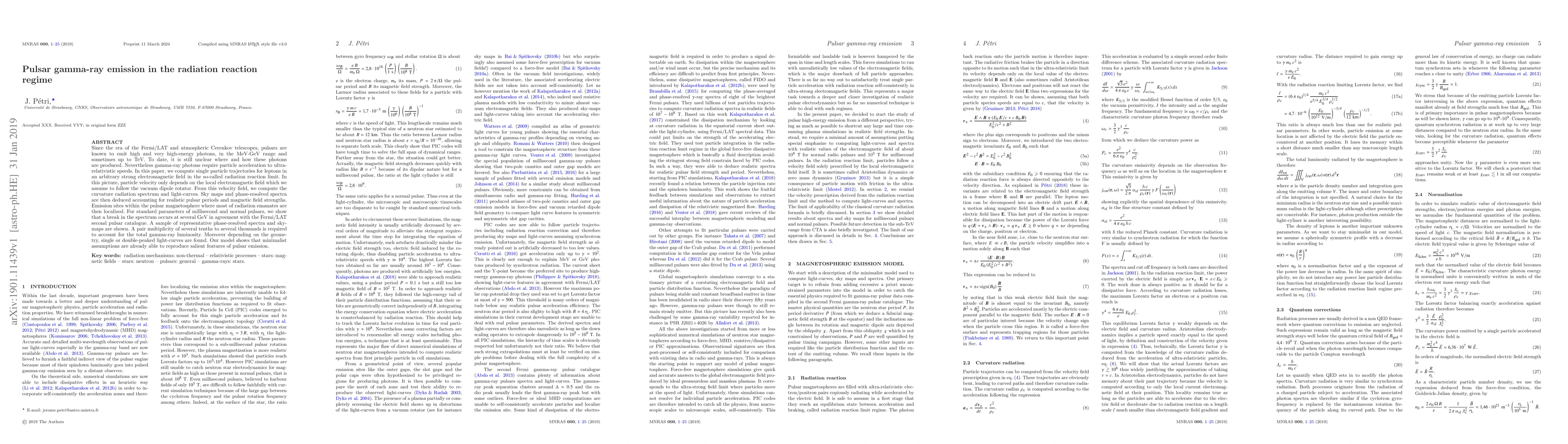 Since the era of the Fermi/LAT and atmospheric Cerenkov telescopes, pulsars are known to emit high and very high-energy photons, in the MeV-GeV range and sometimes up to TeV. To date, it is still unclear where and how these photons are produced. Nevertheless gamma-ray photons require particle acceleration to ultra-relativistic speeds. In this paper, we compute single particle trajectories for leptons in an arbitrary strong electromagnetic field in the so-called radiation reaction limit. In this picture, particle velocity only depends on the local electromagnetic field which we assume to follow the vacuum dipole rotator. From this velocity field, we compute the curvature radiation spectrum and light-curves. Sky maps and phase-resolved spectra are then deduced accounting for realistic pulsar periods and magnetic field strengths. Emission sites within the pulsar magnetosphere where most of radiation emanates are then localized. For standard parameters of millisecond and normal pulsars, we show that a break in the spectrum occurs at several GeV in agreement with the Fermi/LAT second pulsar catalogue. A sample of representative phase-resolved spectra and sky-maps are shown. A pair multiplicity of several tenths to several thousands is required to account for the total gamma-ray luminosity. Moreover depending on the geometry, single or double-peaked light-curves are found. Our model shows that minimalist assumptions are already able to reproduce salient features of pulsar emission.