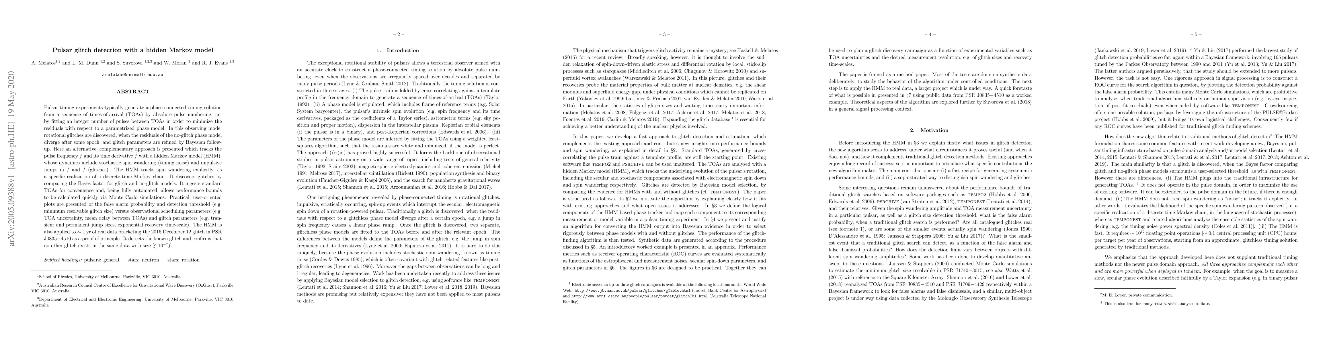 This paper proposes a hidden Markov model (HMM) to detect pulsar glitches by tracking pulse frequency and its time derivative, contrasting it with traditional phase-based methods. The HMM identifies glitches through Bayesian model comparison and is validated on real data from PSR J0835-4510, confirming the 2016 December 12 glitch and ruling out others of similar size.