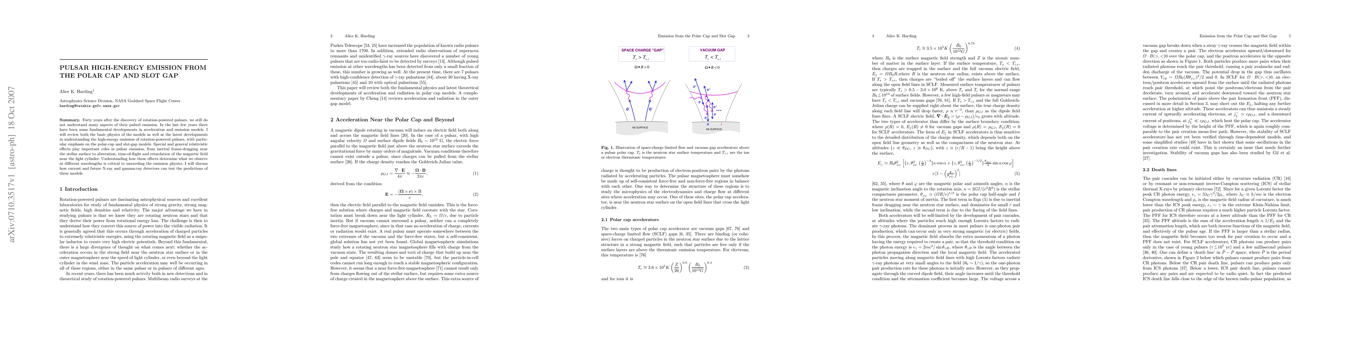 This paper reviews the fundamental physics and recent developments in understanding the high-energy emission from pulsars, focusing on the polar-cap and slot-gap models. It highlights the importance of relativistic effects in determining observed emissions and discusses how current and future X-ray and gamma-ray detectors can test these models.
