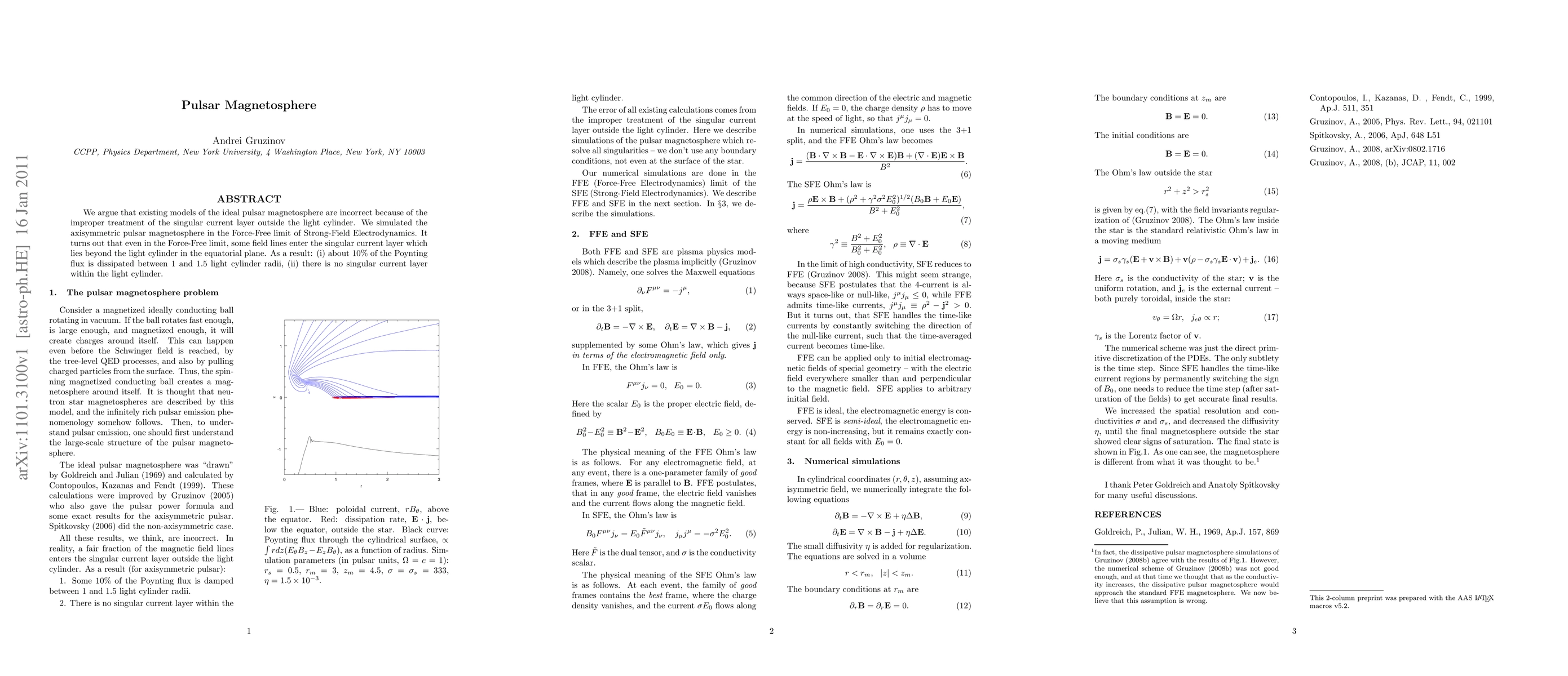 We argue that existing models of the ideal pulsar magnetosphere are incorrect because of the improper treatment of the singular current layer outside the light cylinder. We simulated the axisymmetric pulsar magnetosphere in the Force-Free limit of Strong-Field Electrodynamics. It turns out that even in the Force-Free limit, some field lines enter the singular current layer which lies beyond the light cylinder in the equatorial plane. As a result: (i) about 10% of the Poynting flux is dissipated between 1 and 1.5 light cylinder radii, (ii) there is no singular current layer within the light cylinder.