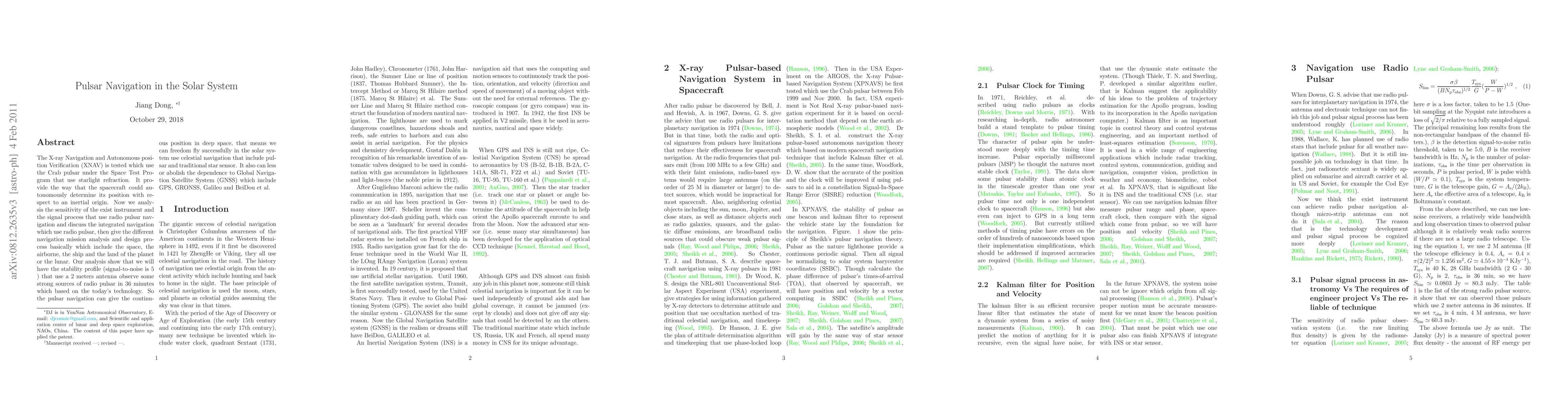 This paper tests the X-ray Navigation and Autonomous position Verification (XNAV) system using the Crab pulsar for spacecraft positioning in deep space. The analysis shows that pulsar navigation can provide continuous position determination, reducing reliance on GNSS systems.