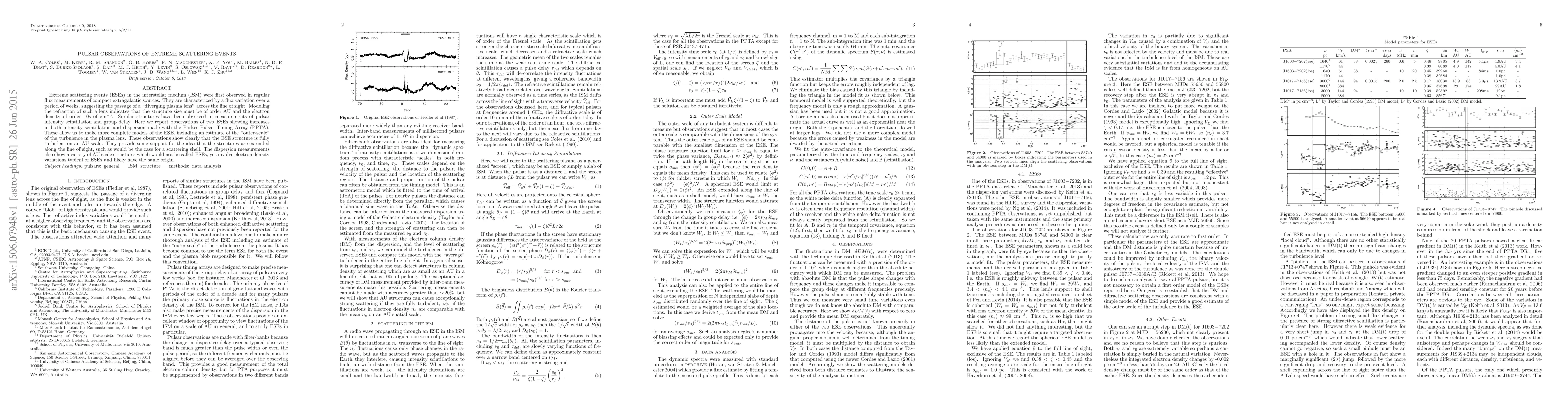 Extreme scattering events (ESEs) in the interstellar medium (ISM) were first observed in regular flux measurements of compact extragalactic sources. They are characterized by a flux variation over a period of weeks, suggesting the passage of a "diverging plasma lens" across the line of sight. Modeling the refraction of such a lens indicates that the structure size must be of order AU and the electron density of order 10s of cm^{-3}. Similar structures have been observed in measurements of pulsar intensity scintillation and group delay. Here we report observations of two ESEs showing increases in both intensity scintillation and dispersion made with the Parkes Pulsar Timing Array (PPTA). These allow us to make more complete models of the ESE, including an estimate of the "outer-scale" of the turbulence in the plasma lens. These observations show clearly that the ESE structure is fully turbulent on an AU scale. They provide some support for the idea that the structures are extended along the line of sight, such as would be the case for a scattering shell. The dispersion measurements also show a variety of AU scale structures which would not be called ESEs, yet involve electron density variations typical of ESEs and likely have the same origin.