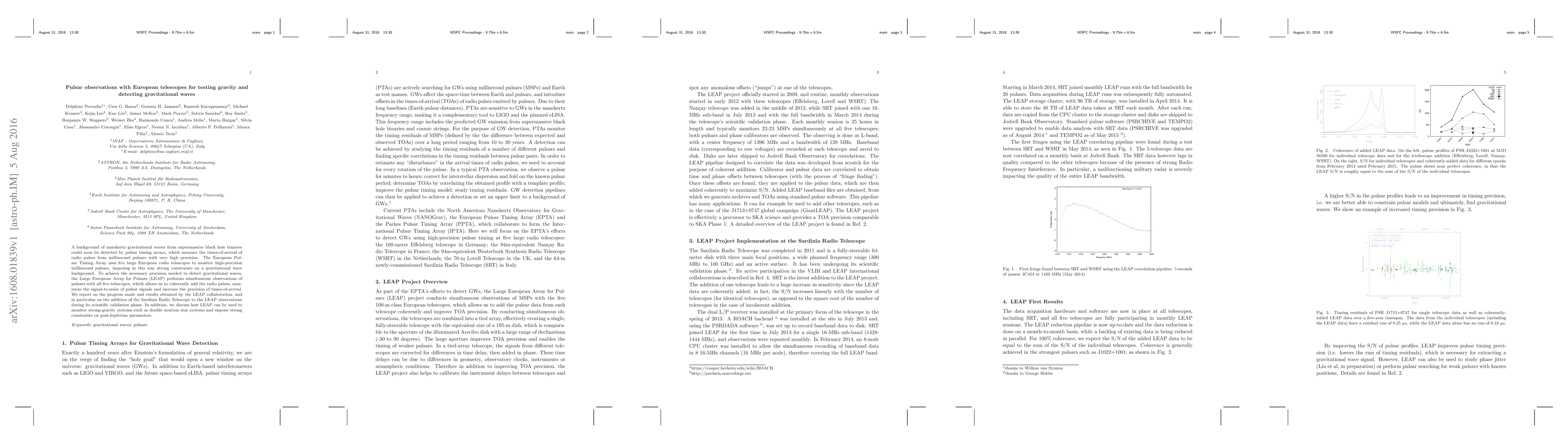 The European Pulsar Timing Array, utilizing five large telescopes, aims to detect nanohertz gravitational waves from supermassive black hole binaries and monitor millisecond pulsars for high precision. The addition of the Sardinia Radio Telescope enhances LEAP's capabilities, improving signal-to-noise ratios and enabling stringent tests of gravity and constraints on strong-gravity systems.