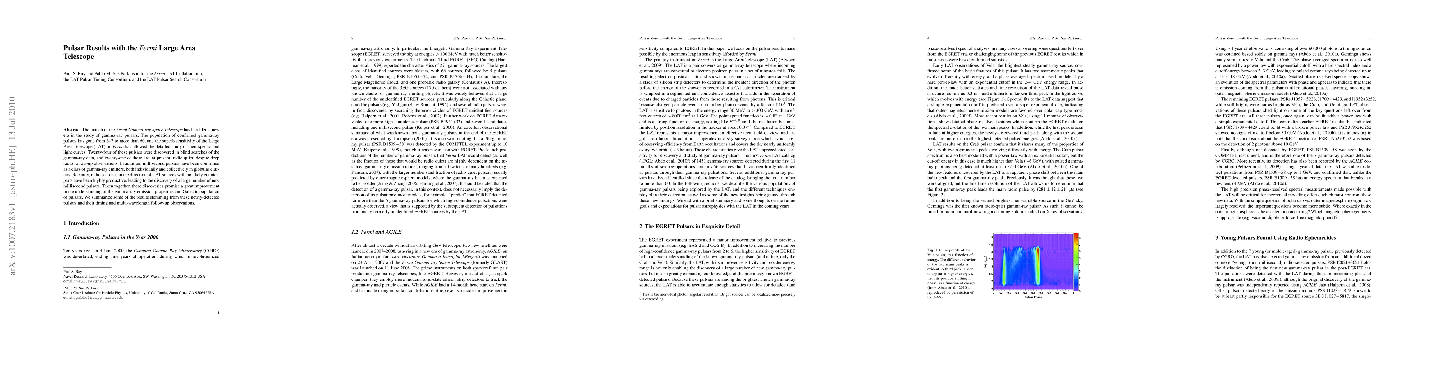 The launch of the Fermi Gamma-ray Space Telescope has heralded a new era in the study of gamma-ray pulsars. The population of confirmed gamma-ray pulsars has gone from 6-7 to more than 60, and the superb sensitivity of the Large Area Telescope (LAT) on Fermi has allowed the detailed study of their spectra and light curves. Twenty-four of these pulsars were discovered in blind searches of the gamma-ray data, and twenty-one of these are, at present, radio quiet, despite deep radio follow-up observations. In addition, millisecond pulsars have been confirmed as a class of gamma-ray emitters, both individually and collectively in globular clusters. Recently, radio searches in the direction of LAT sources with no likely counterparts have been highly productive, leading to the discovery of a large number of new millisecond pulsars. Taken together, these discoveries promise a great improvement in the understanding of the gamma-ray emission properties and Galactic population of pulsars. We summarize some of the results stemming from these newly-detected pulsars and their timing and multi-wavelength follow-up observations.