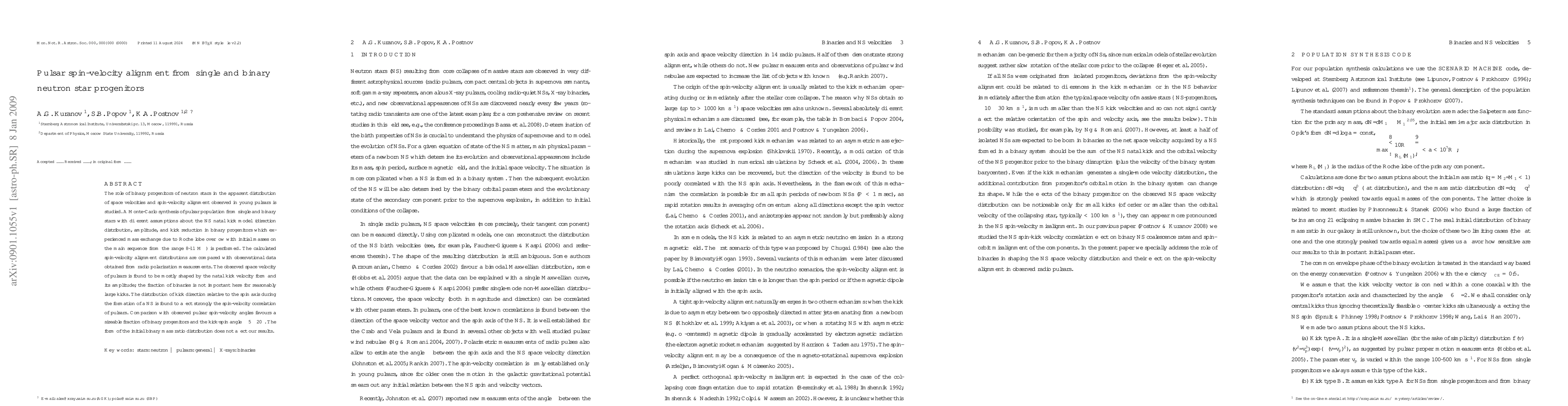 The role of binary progenitors of neutron stars in the apparent distribution of space velocities and spin-velocity alignment observed in young pulsars is studied. A Monte-Carlo synthesis of pulsar population from single and binary stars with different assumptions about the NS natal kick model (direction distribution, amplitude, and kick reduction in binary progenitors which experienced mass exchange due to Roche lobe overflow with initial masses on the main sequence from the range 8-11 $M_\odot$) is performed. The calculated spin-velocity alignment distributions are compared with observational data obtained from radio polarization measurements. The observed space velocity of pulsars is found to be mostly shaped by the natal kick velocity form and its amplitude; the fraction of binaries is not important here for reasonably large kicks. The distribution of kick direction relative to the spin axis during the formation of a NS is found to affect strongly the spin-velocity correlation of pulsars. Comparison with observed pulsar spin-velocity angles favours a sizeable fraction of binary progenitors and the kick-spin angle $\sim 5-20^\circ$. The form of the initial binary mass ratio distribution does not affect our results.