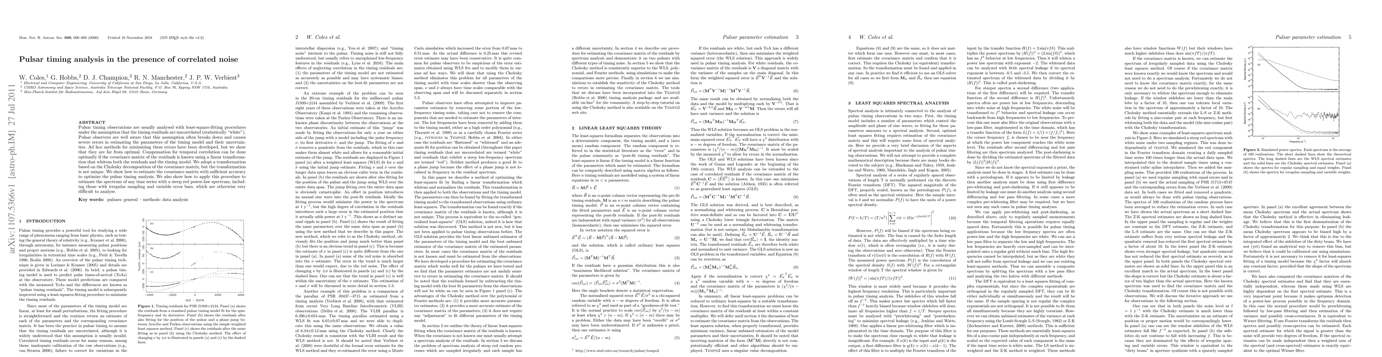 Pulsar timing observations are usually analysed with least-square-fitting procedures under the assumption that the timing residuals are uncorrelated (statistically "white"). Pulsar observers are well aware that this assumption often breaks down and causes severe errors in estimating the parameters of the timing model and their uncertainties. Ad hoc methods for minimizing these errors have been developed, but we show that they are far from optimal. Compensation for temporal correlation can be done optimally if the covariance matrix of the residuals is known using a linear transformation that whitens both the residuals and the timing model. We adopt a transformation based on the Cholesky decomposition of the covariance matrix, but the transformation is not unique. We show how to estimate the covariance matrix with sufficient accuracy to optimize the pulsar timing analysis. We also show how to apply this procedure to estimate the spectrum of any time series with a steep red power-law spectrum, including those with irregular sampling and variable error bars, which are otherwise very difficult to analyse.