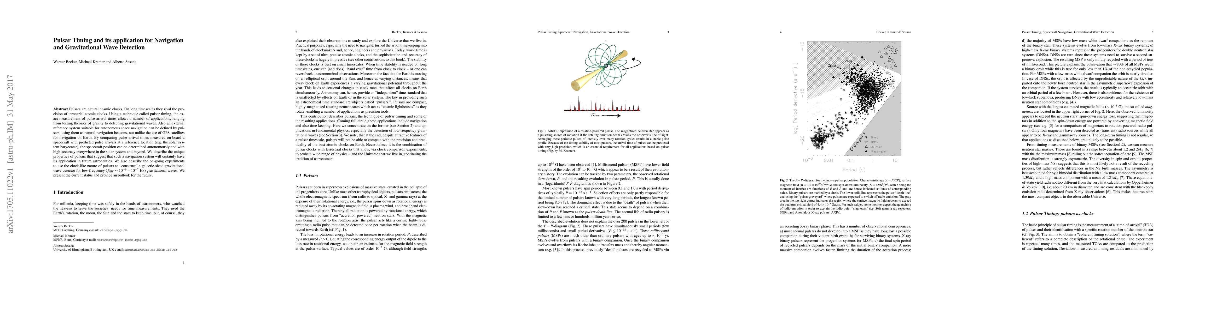 Pulsars are natural cosmic clocks. On long timescales they rival the precision of terrestrial atomic clocks. Using a technique called pulsar timing, the exact measurement of pulse arrival times allows a number of applications, ranging from testing theories of gravity to detecting gravitational waves. Also an external reference system suitable for autonomous space navigation can be defined by pulsars, using them as natural navigation beacons, not unlike the use of GPS satellites for navigation on Earth. By comparing pulse arrival times measured on-board a spacecraft with predicted pulse arrivals at a reference location (e.g. the solar system barycenter), the spacecraft position can be determined autonomously and with high accuracy everywhere in the solar system and beyond. We describe the unique properties of pulsars that suggest that such a navigation system will certainly have its application in future astronautics. We also describe the on-going experiments to use the clock-like nature of pulsars to "construct" a galactic-sized gravitational wave detector for low-frequency (f_GW ~1E-9 - 1E-7 Hz) gravitational waves. We present the current status and provide an outlook for the future.
