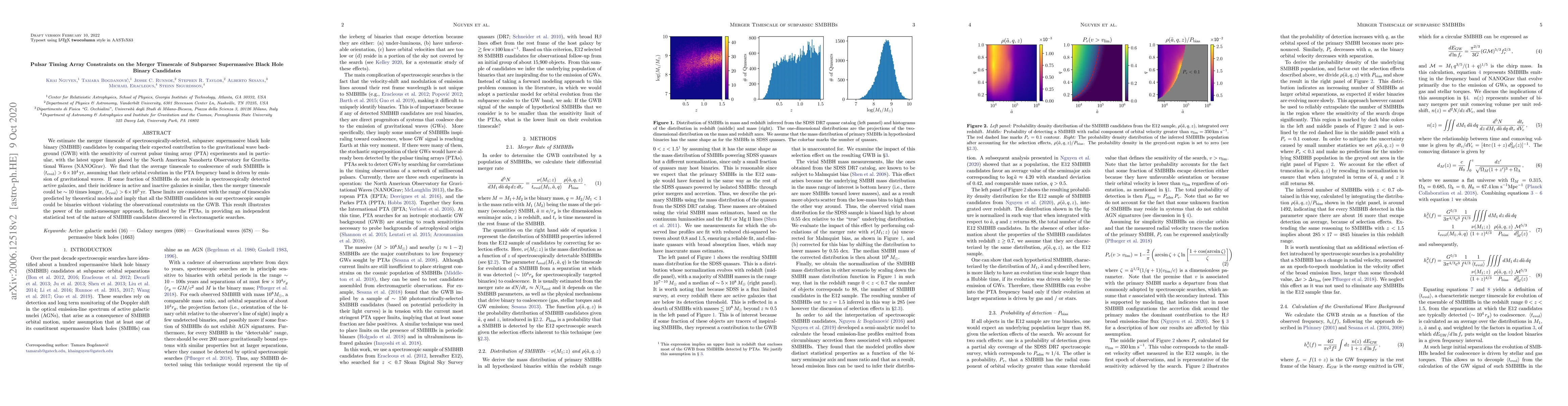 We estimate the merger timescale of spectroscopically-selected, subparsec supermassive black hole binary (SMBHB) candidates by comparing their expected contribution to the gravitational wave background (GWB) with the sensitivity of current pulsar timing array (PTA) experiments and in particular, with the latest upper limit placed by the North American Nanohertz Observatory for Gravitational Waves (NANOGrav). We find that the average timescale to coalescence of such SMBHBs is $\langle t_{\rm evol} \rangle > 6\times 10^4\,$yr, assuming that their orbital evolution in the PTA frequency band is driven by emission of gravitational waves. If some fraction of SMBHBs do not reside in spectroscopically detected active galaxies, and their incidence in active and inactive galaxies is similar, then the merger timescale could be $\sim 10$ times longer, $\langle t_{\rm evol} \rangle > 6\times 10^5\,$yr. These limits are consistent with the range of timescales predicted by theoretical models and imply that all the SMBHB candidates in our spectroscopic sample could be binaries without violating the observational constraints on the GWB. This result illustrates the power of the multi-messenger approach, facilitated by the PTAs, in providing an independent statistical test of the nature of SMBHB candidates discovered in electromagnetic searches.
