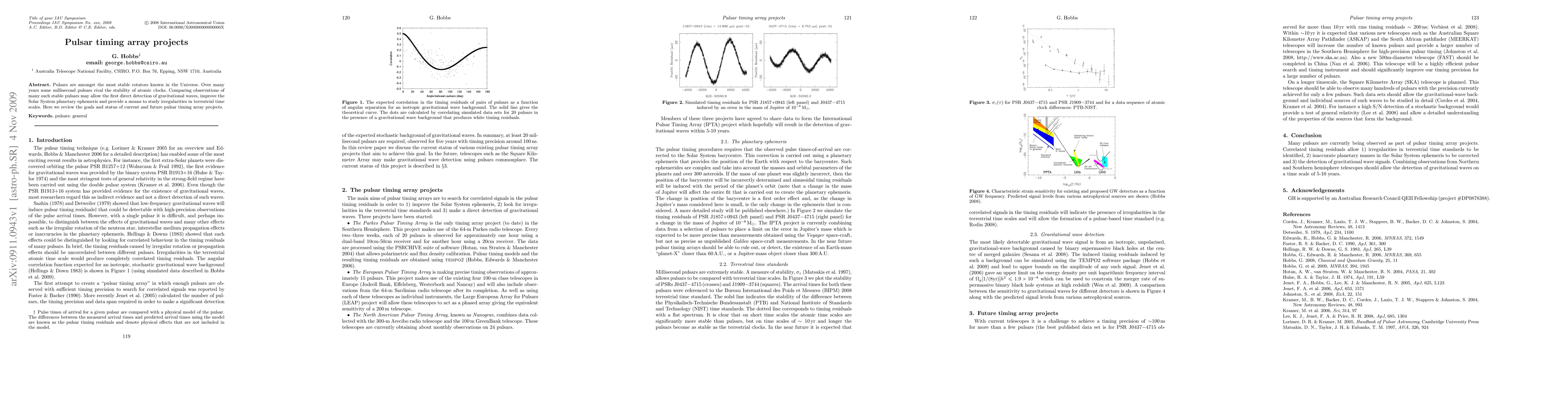 Pulsar timing array projects aim to detect gravitational waves, improve planetary ephemeris, and study time irregularities using millisecond pulsars' stability. The project reviews current and future initiatives to achieve these goals.