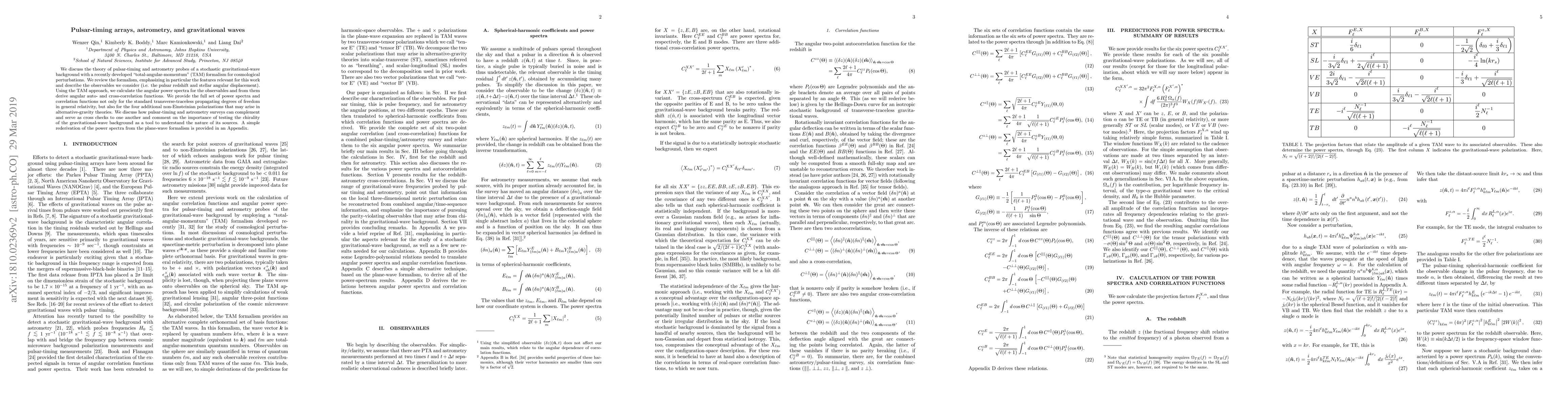 This paper explores pulsar-timing and astrometry as methods to detect a stochastic gravitational-wave background using a new "total-angular-momentum" formalism. It calculates angular power spectra and correlation functions for both standard and alternative-gravity polarizations, emphasizing their complementary roles and the importance of testing gravitational-wave background chirality.