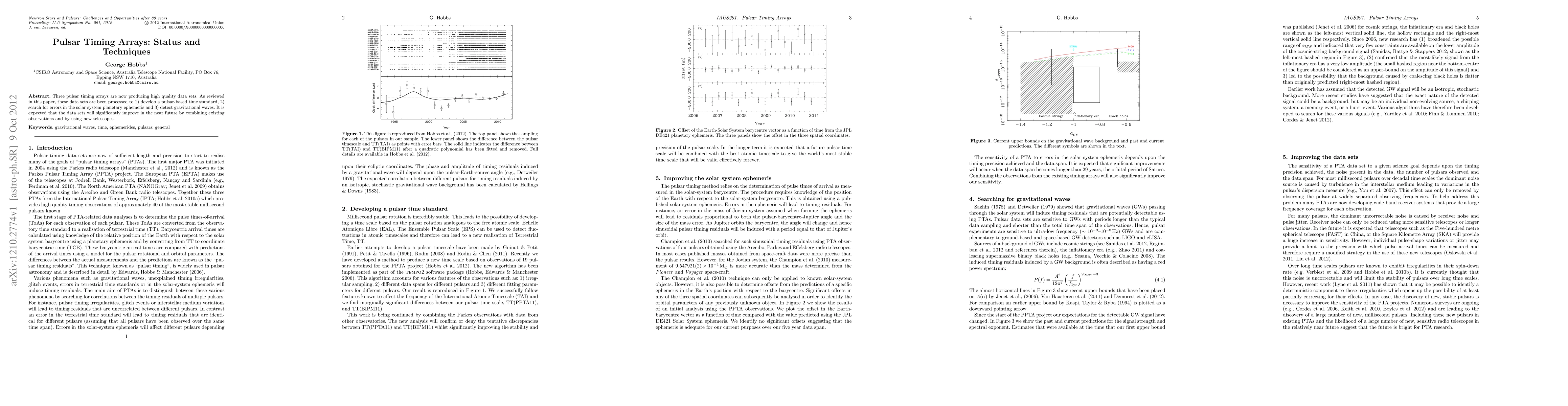 This paper reviews the current status and techniques of three pulsar timing arrays generating high-quality datasets to develop a pulsar-based time standard, refine solar system planetary ephemerides, and detect gravitational waves, with expectations for significant future improvements through data integration and new telescopes.