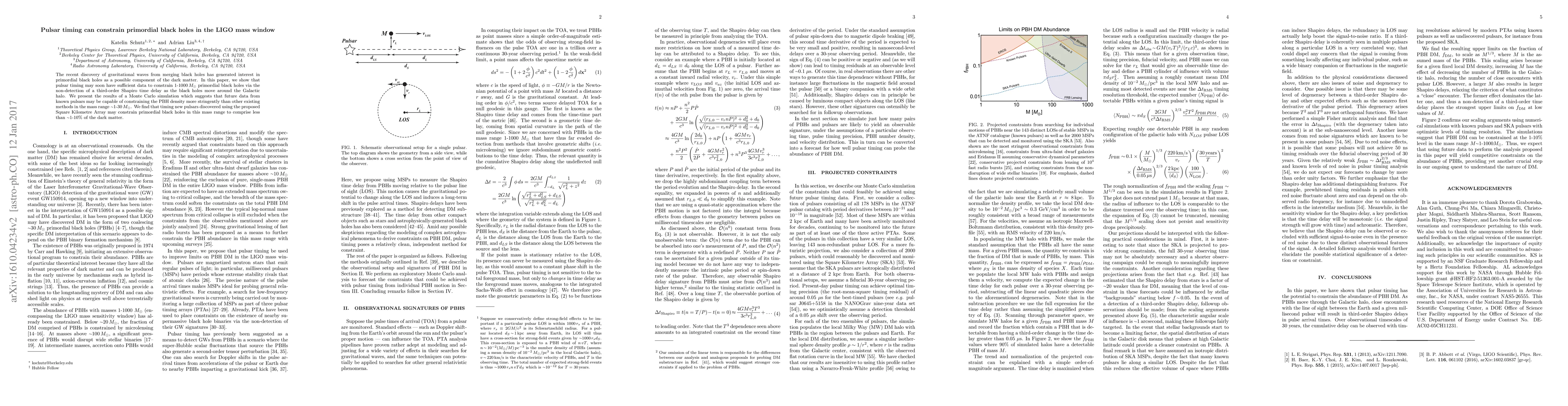 This paper demonstrates that pulsar timing data can constrain the presence of primordial black holes in the mass range of 1-1000 solar masses, particularly through the non-detection of a third-order Shapiro time delay. Future pulsar timing observations, especially from new pulsars detected by the Square Kilometre Array, may limit the contribution of primordial black holes to dark matter to less than 1-10%.