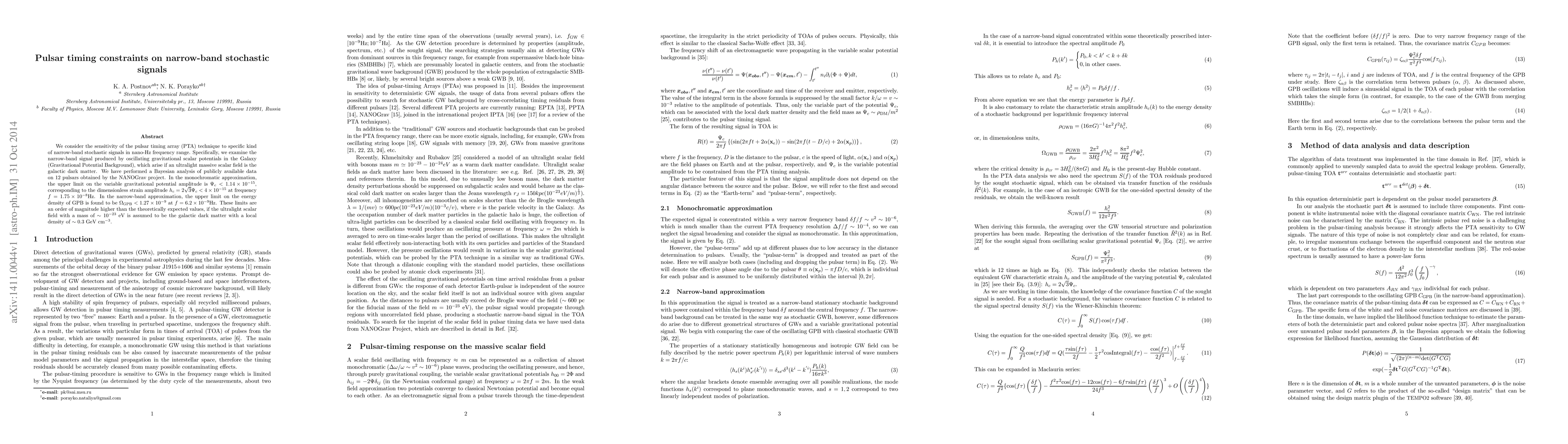 We consider the sensitivity of the pulsar timing array (PTA) technique to specific kind of narrow-band stochastic signals in nano-Hz frequency range. Specifically, we examine the narrow-band signal produced by oscillating gravitational scalar potentials in the Galaxy (Gravitational Potential Background), which arise if an ultralight massive scalar field is the galactic dark matter. We have performed a Bayesian analysis of publicly available data on 12 pulsars obtained by the NANOGrav project. In the monochromatic approximation, the upper limit on the variable gravitational potential amplitude is $\Psi_c<1.14 \times 10^{-15}$, corresponding to the dimensionless strain amplitude $h_c=2\sqrt{3}\Psi_c < 4\times 10^{-15}$ at frequency $f=1.75\times 10^{-8} Hz$. In the narrow-band approximation, the upper limit on the energy density of GPB is found to be $\Omega_{GPB}<1.27 \times 10^{-9}$ at $f=6.2\times 10^{-9} Hz$. These limits are an order of magnitude higher than the theoretically expected values, if the ultralight scalar field with a mass of $\sim 10^{-23} eV$ is assumed to be the galactic dark matter with a local density of $\sim 0.3 GeV cm^{-3}$.