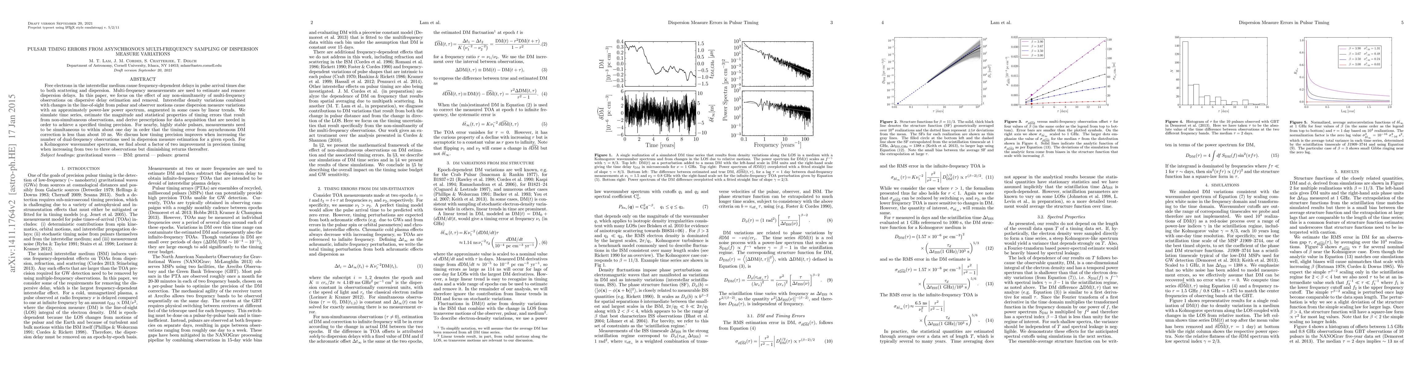 This paper investigates the timing errors in pulsar observations due to asynchronous multi-frequency sampling and dispersion measure variations. It finds that for nearby, stable pulsars, simultaneous observations are crucial to minimize timing errors, with non-simultaneity causing errors exceeding 10 ns if not within a day. Increasing the number of dual-frequency observations improves timing precision, though benefits diminish after three observations.