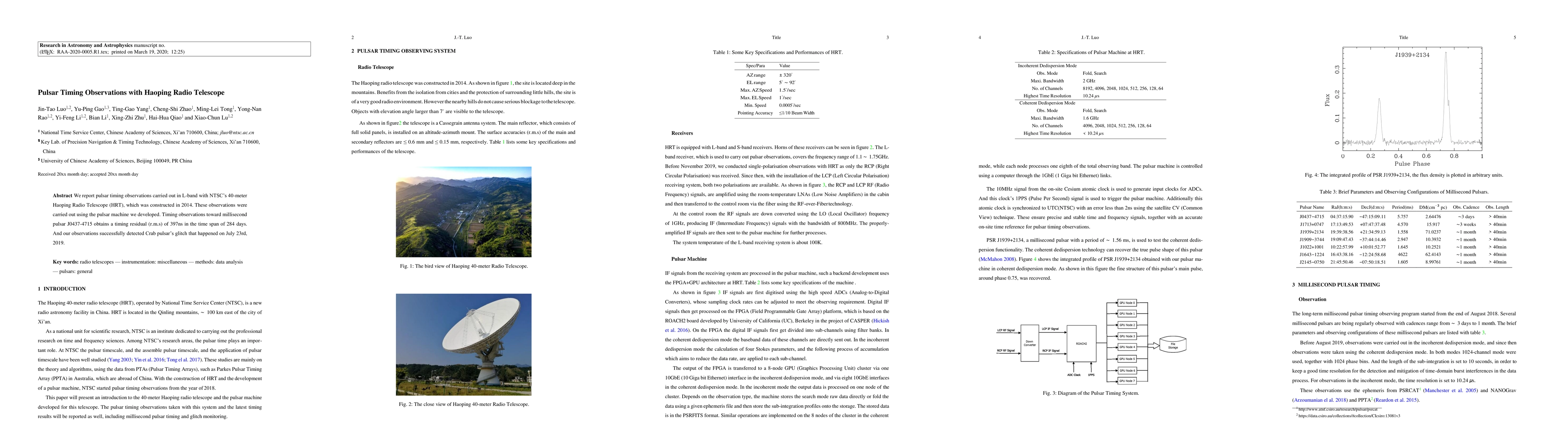 We report pulsar timing observations carried out in L-band with NTSC's 40-meter Haoping Radio Telescope (HRT), which was constructed in 2014. The observations were carried out using the pulsar machine we developed. Timing observations toward millisecond pulsar J0437-4715 obtains a timing residual (r.m.s) of 397ns in the time span of 284 days. And our observations successfully detected Crab pulsar's glitch that happened on July 23rd, 2019.