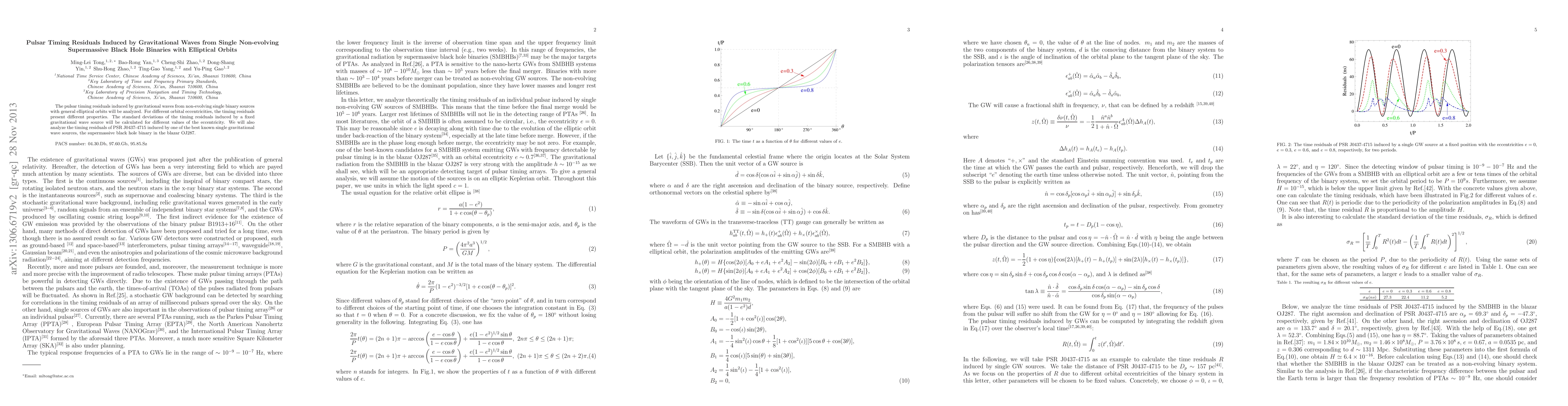 This paper analyzes pulsar timing residuals caused by gravitational waves from non-evolving supermassive black hole binaries with elliptical orbits, focusing on how different eccentricities affect these residuals. The study calculates the standard deviations of timing residuals for various eccentricities and examines the residuals of PSR J0437-4715 from the gravitational wave source in OJ287.