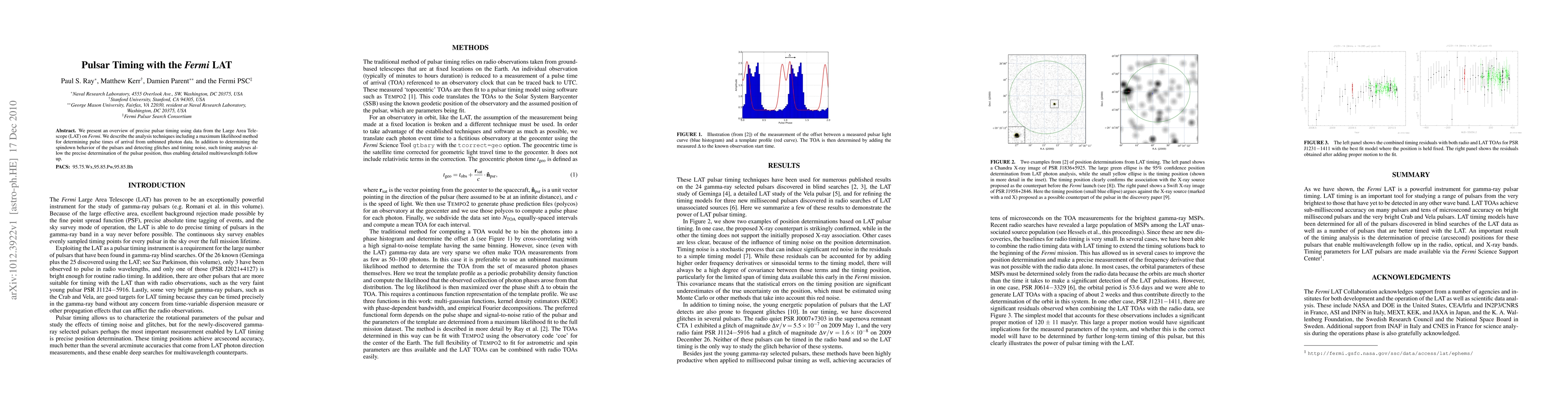 We present an overview of precise pulsar timing using data from the Large Area Telescope (LAT) on Fermi. We describe the analysis techniques including a maximum likelihood method for determining pulse times of arrival from unbinned photon data. In addition to determining the spindown behavior of the pulsars and detecting glitches and timing noise, such timing analyses allow the precise determination of the pulsar position, thus enabling detailed multiwavelength follow up.