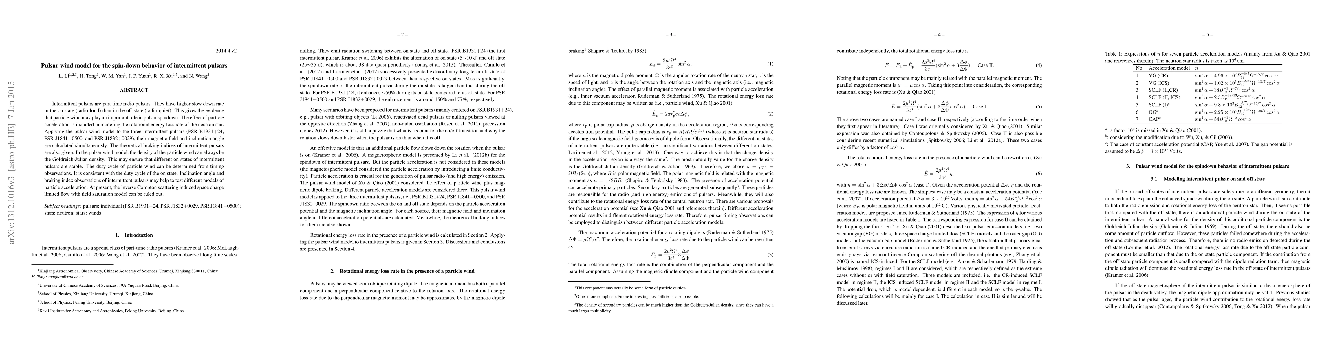 Intermittent pulsars are part-time radio pulsars. They have higher slow down rate in the on state (radio-loud) than in the off state (radio-quiet). This gives the evidence that particle wind may play an important role in pulsar spindown. The effect of particle acceleration is included in modeling the rotational energy loss rate of the neutron star. Applying the pulsar wind model to the three intermittent pulsars (PSR B1931+24, PSR J1841-0500, and PSR J1832+0029), their magnetic field and inclination angle are calculated simultaneously. The theoretical braking indices of intermittent pulsars are also given. In the pulsar wind model, the density of the particle wind can always be the Goldreich-Julian density. This may ensure that different on states of intermittent pulsars are stable. The duty cycle of particle wind can be determined from timing observations. It is consistent with the duty cycle of the on state. Inclination angle and braking index observations of intermittent pulsars may help to test different models of particle acceleration. At present, the inverse Compton scattering induced space charge limited flow with field saturation model can be ruled out.