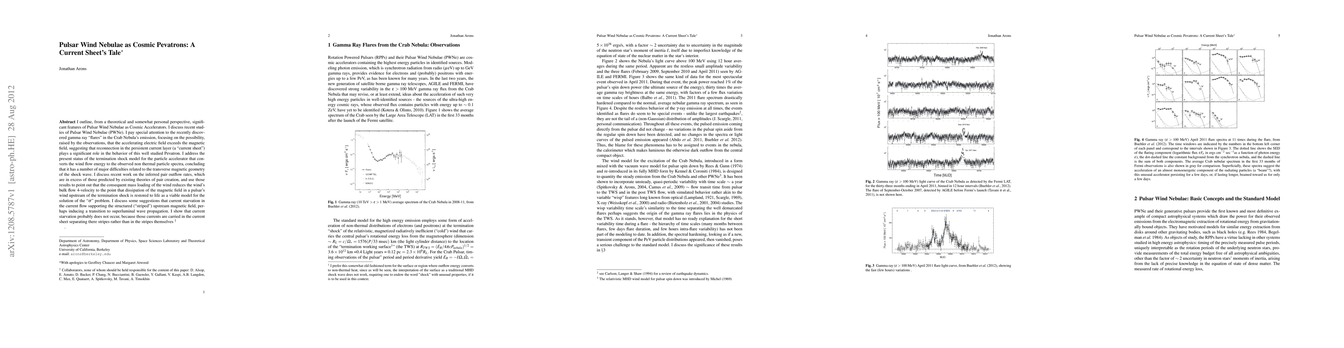 I outline, from a theoretical and somewhat personal perspective, significant features of Pulsar Wind Nebulae as Cosmic Accelerators. I discuss recent studies of Pulsar Wind Nebulae (PWNe). I pay special attention to the recently discovered gamma ray flares in the Crab Nebula's emission, focusing on the possibility, raised by the observations, that the accelerating electric field exceeds the magnetic field, suggesting that reconnection in the persistent current layer (a current sheet) plays a significant role in the behavior of this well studied Pevatron. I address the present status of the termination shock model for the particle accelerator that converts the wind flow energy to the observed non thermal particle spectra, concluding that it has a number of major difficulties related to the transverse magnetic geometry of the shock wave. I discuss recent work on the inferred pair outflow rates, which are in excess of those predicted by existing theories of pair creation, and use those results to point out that the consequent mass loading of the wind reduces the wind's bulk flow 4-velocity to the point that dissipation of the magnetic field in a pulsar's wind upstream of the termination shock is restored to life as a viable model for the solution of the "sigma problem". I discuss some suggestions that current starvation in the current flow supporting the structured ("striped") upstream magnetic field induces a transition to superluminal wave propagation. I show that current starvation probably does not occur, because those currents are carried in the current sheet separating there stripes rather than in the stripes themselves.