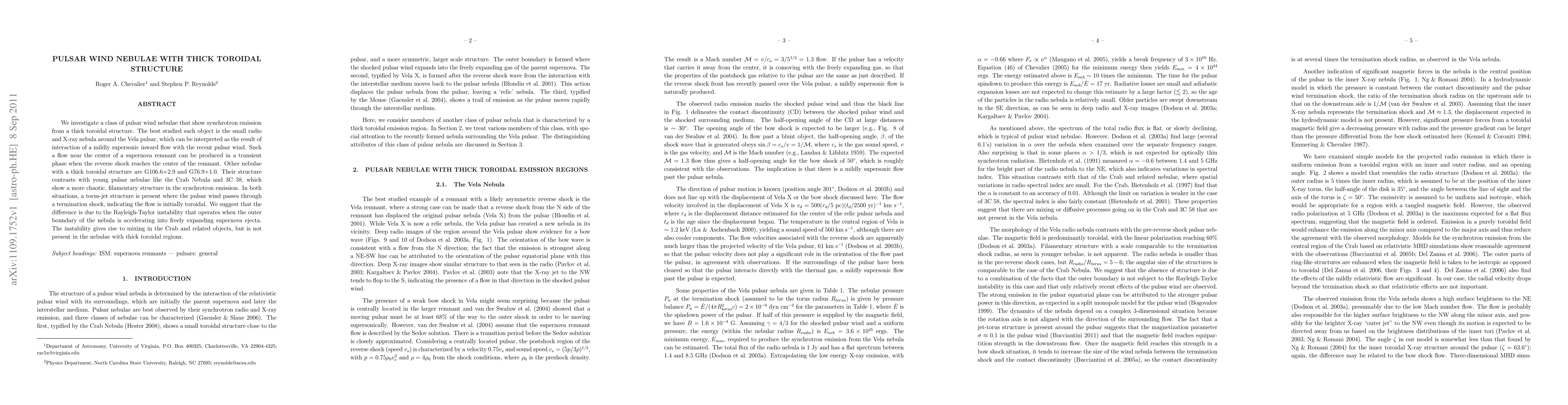 This paper explores pulsar wind nebulae characterized by thick toroidal structures, exemplified by the Vela pulsar nebula, and contrasts them with more chaotic, filamentary structures seen in young pulsar nebulae like the Crab Nebula. The authors suggest that the difference arises due to the Rayleigh-Taylor instability affecting the latter.