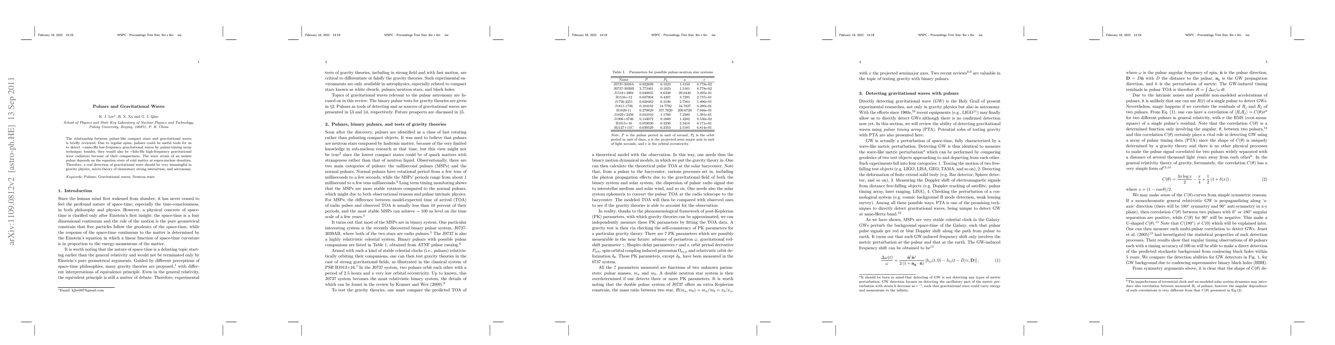 The relationship between pulsar-like compact stars and gravitational waves is briefly reviewed. Due to regular spins, pulsars could be useful tools for us to detect ~nano-Hz low-frequency gravitational waves by pulsar-timing array technique; besides, they would also be ~kilo-Hz high-frequency gravitational wave radiators because of their compactness. The wave strain of an isolate pulsar depends on the equation state of cold matter at supra-nuclear densities. Therefore, a real detection of gravitational wave should be very meaningful in gravity physics, micro-theory of elementary strong interaction, and astronomy.