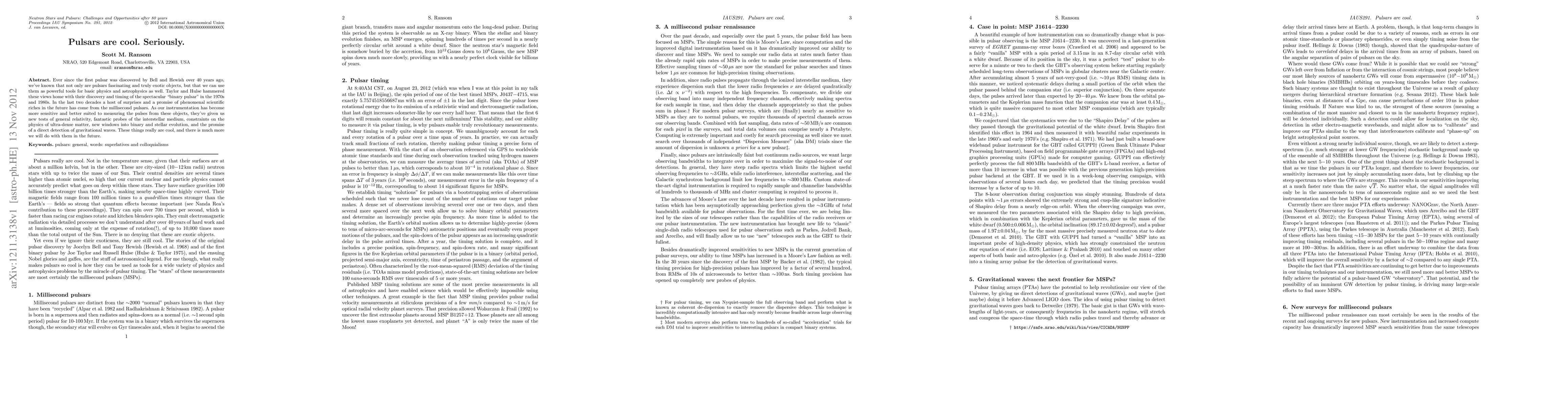 Ever since the first pulsar was discovered by Bell and Hewish over 40 years ago, we've known that not only are pulsars fascinating and truly exotic objects, but that we can use them as powerful tools for basic physics and astrophysics as well. Taylor and Hulse hammered these views home with their discovery and timing of the spectacular "binary pulsar" in the 1970s and 1980s. In the last two decades a host of surprises and a promise of phenomenal scientific riches in the future has come from the millisecond pulsars. As our instrumentation has become more sensitive and better suited to measuring the pulses from these objects, they've given us new tests of general relativity, fantastic probes of the interstellar medium, constraints on the physics of ultra-dense matter, new windows into binary and stellar evolution, and the promise of a direct detection of gravitational waves. These things really are cool, and there is much more we will do with them in the future.