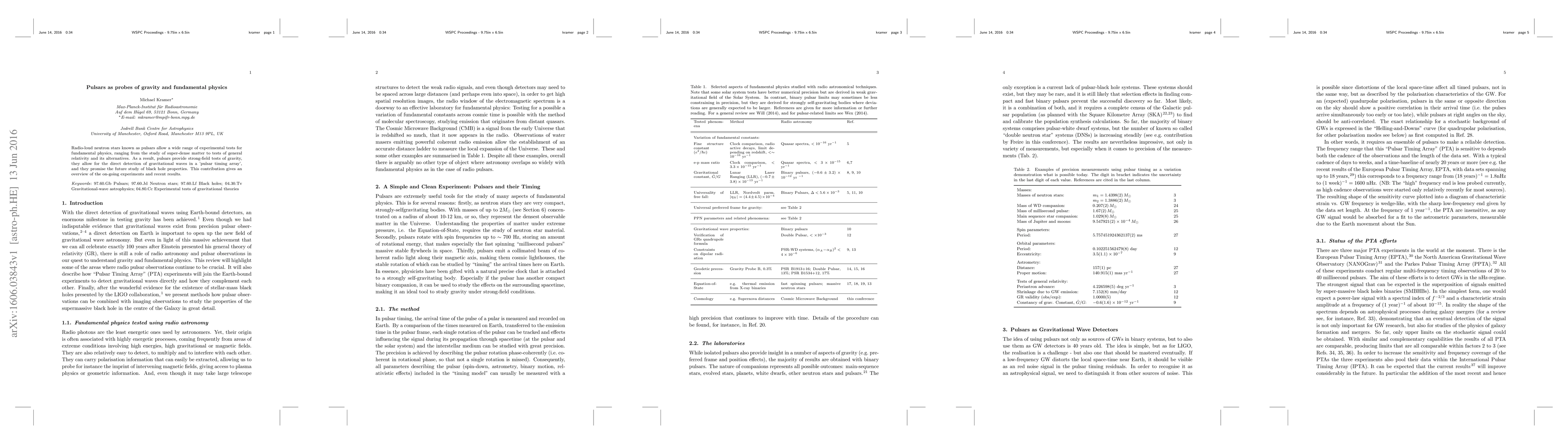 Radio-loud neutron stars known as pulsars allow a wide range of experimental tests for fundamental physics, ranging from the study of super-dense matter to tests of general relativity and its alternatives. As a result, pulsars provide strong-field tests of gravity, they allow for the direct detection of gravitational waves in a 'pulsar timing array', and they promise the future study of black hole properties. This contribution gives an overview of the on-going experiments and recent results.