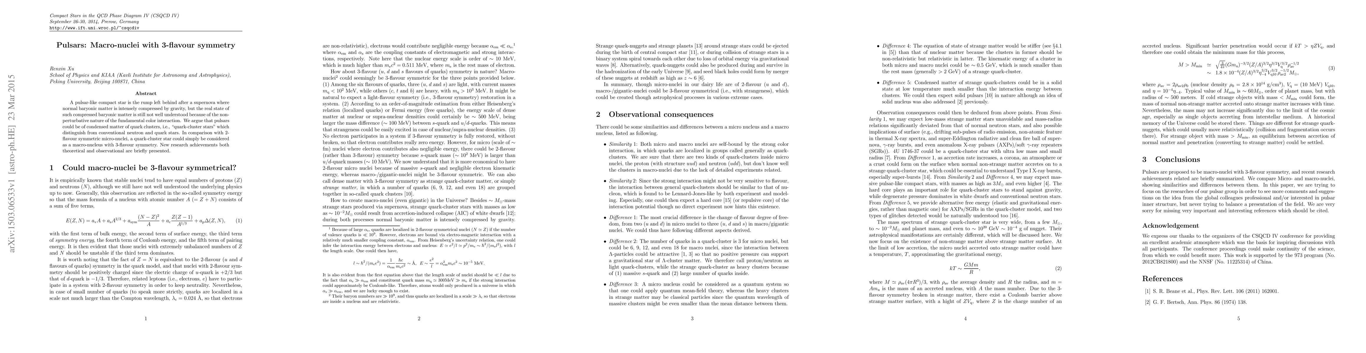 A pulsar-like compact star is the rump left behind after a supernova where normal baryonic matter is intensely compressed by gravity, but the real state of such compressed baryonic matter is still not well understood because of the non-perturbative nature of the fundamental color interaction. We argue that pulsars could be of condensed matter of quark clusters, i.e., "quark-cluster stars" which distinguish from conventional neutron and quark stars. In comparison with 2-flavour symmetric micro-nuclei, a quark-cluster star could simply be considered as a macro-nucleus with 3-flavour symmetry. New research achievements both theoretical and observational are briefly presented.
