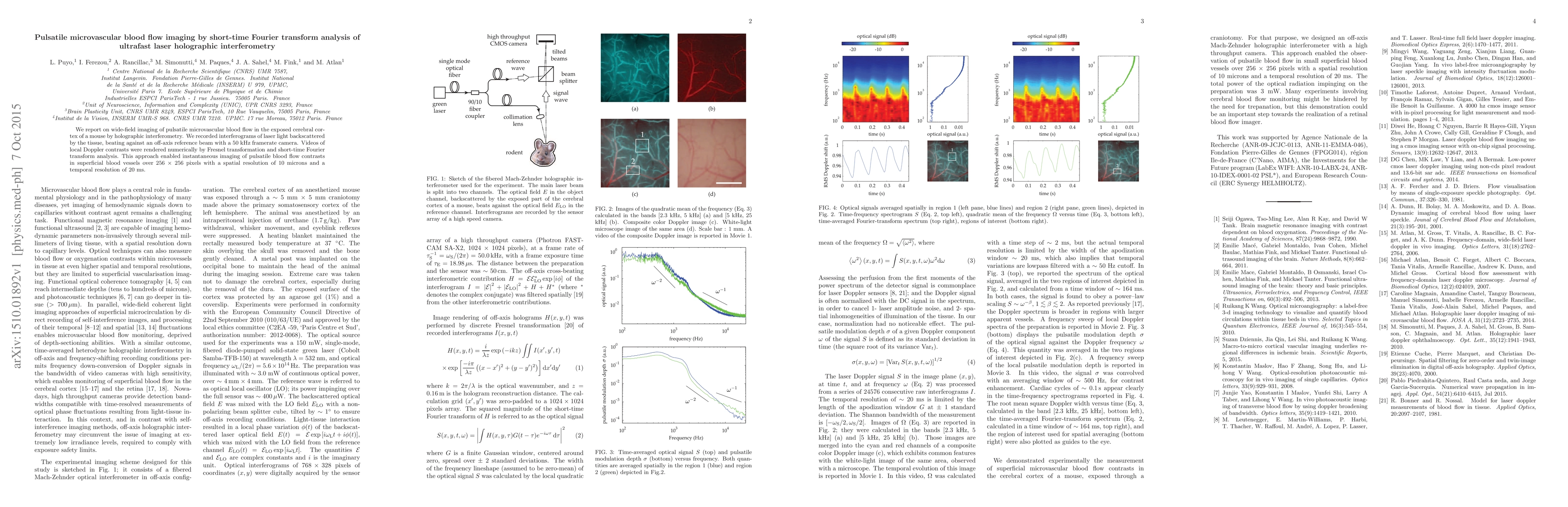 This paper presents a method for imaging pulsatile microvascular blood flow in the mouse cerebral cortex using ultrafast laser holographic interferometry and short-time Fourier transform analysis. The technique achieves high-resolution, real-time visualization of blood flow dynamics with a spatial resolution of 10 microns and a temporal resolution of 20 ms.