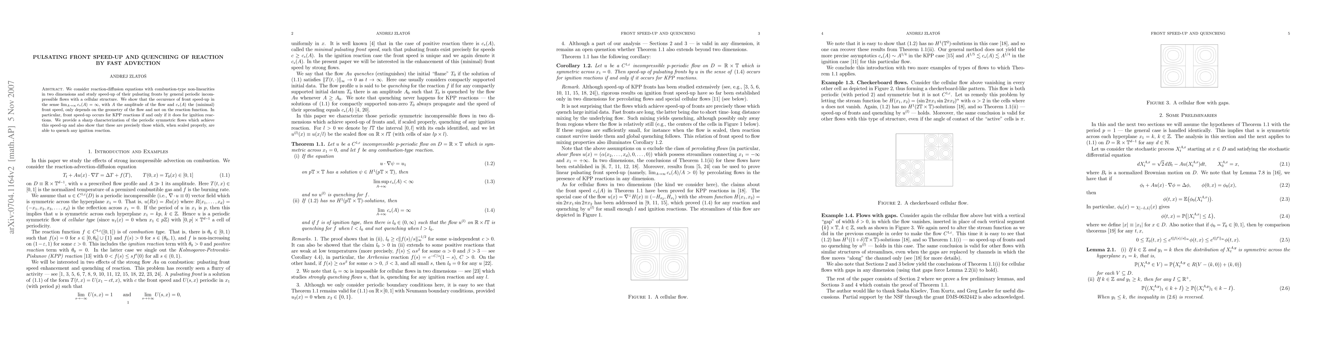 This paper investigates how periodic incompressible flows with cellular structures can accelerate the speed of pulsating fronts in reaction-diffusion equations with combustion-type non-linearities. It demonstrates that front speed-up depends solely on the flow geometry, not the reaction type, and identifies flows that can both speed up and quench ignition reactions.