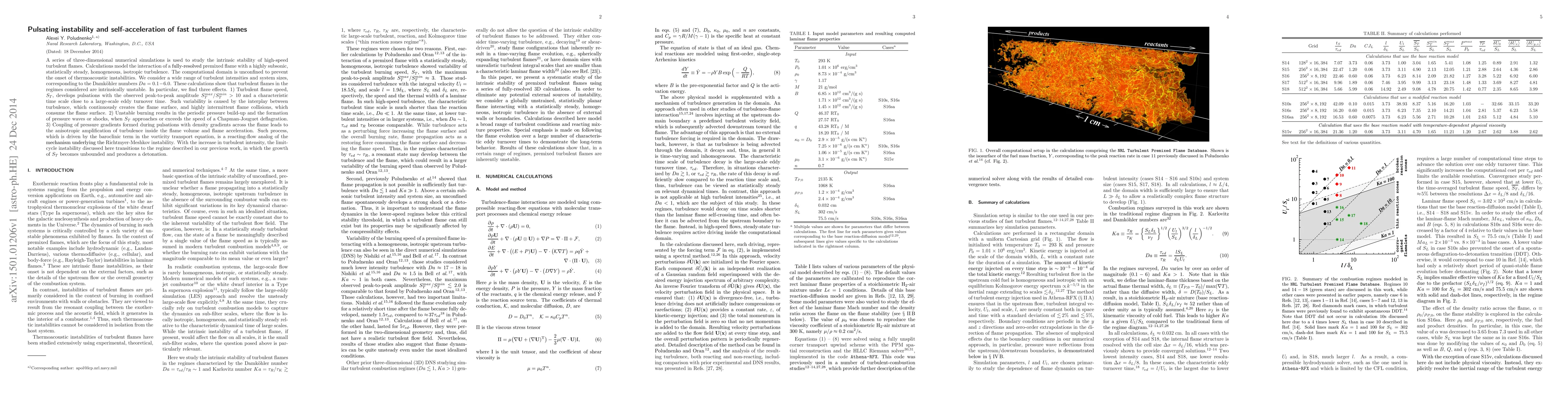 (Abridged) A series of three-dimensional numerical simulations is used to study the intrinsic stability of high-speed turbulent flames. Calculations model the interaction of a fully-resolved premixed flame with a highly subsonic, statistically steady, homogeneous, isotropic turbulence. We consider a wide range of turbulent intensities and system sizes, corresponding to the Damk\"ohler numbers Da = 0.1-6.0. These calculations show that turbulent flames in the regimes considered are intrinsically unstable. In particular, we find three effects. 1) Turbulent flame speed develops pulsations with the observed peak-to-peak amplitude > 10 and a characteristic time scale close to a large-scale eddy turnover time. Such variability is caused by the interplay between turbulence, which continuously creates the flame surface, and highly intermittent flame collisions, which consume the flame surface. 2) Unstable burning results in the periodic pressure build-up and the formation of pressure waves or shocks, when the flame speed approaches or exceeds the speed of a Chapman-Jouguet deflagration. 3) Coupling of pressure gradients formed during pulsations with density gradients across the flame leads to the anisotropic amplification of turbulence inside the flame volume and flame acceleration. Such process, which is driven by the baroclinic term in the vorticity transport equation, is a reacting-flow analog of the mechanism underlying the Richtmyer-Meshkov instability. With the increase in turbulent intensity, the limit-cycle instability discussed here transitions to the regime described in our previous work, in which the growth of the flame speed becomes unbounded and produces a detonation.