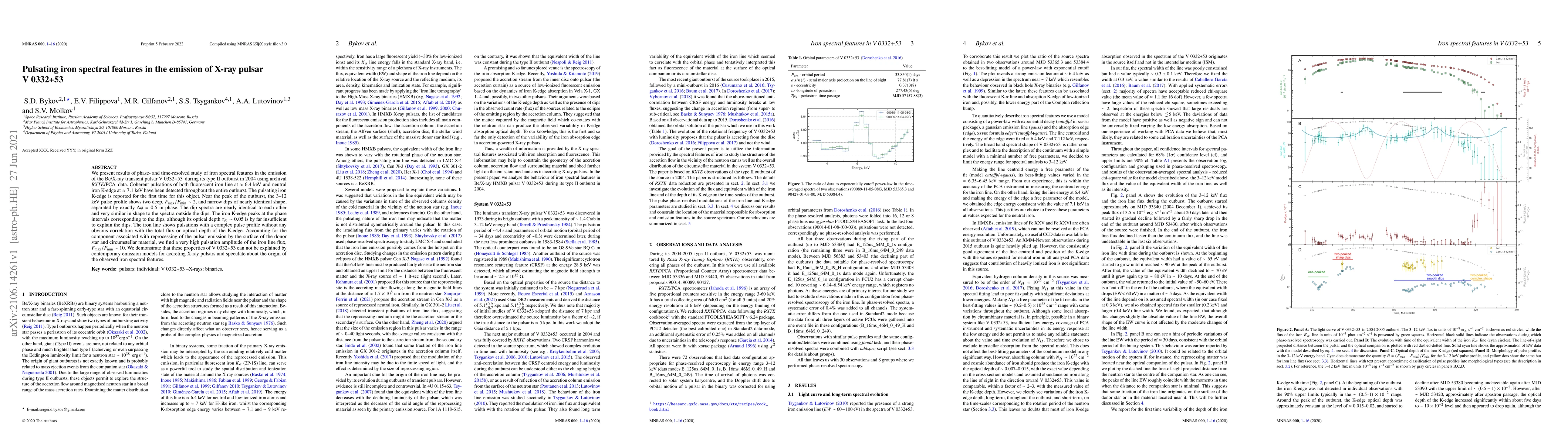The study of X-ray pulsar V0332+53 during its 2004 outburst revealed coherent pulsations in iron spectral features (K-edge at ~7.1 keV and fluorescent line at ~6.4 keV), with a previously unreported pulsating iron K-edge. Unique dips in the 3-12 keV pulse profile, with phases separated by 0.5, were observed, accompanied by iron K-edge peaks but not explained by current accreting X-ray pulsar emission models. The iron line pulsations showed high amplitude (~10) and a complex profile, suggesting unconventional origin of these spectral features.