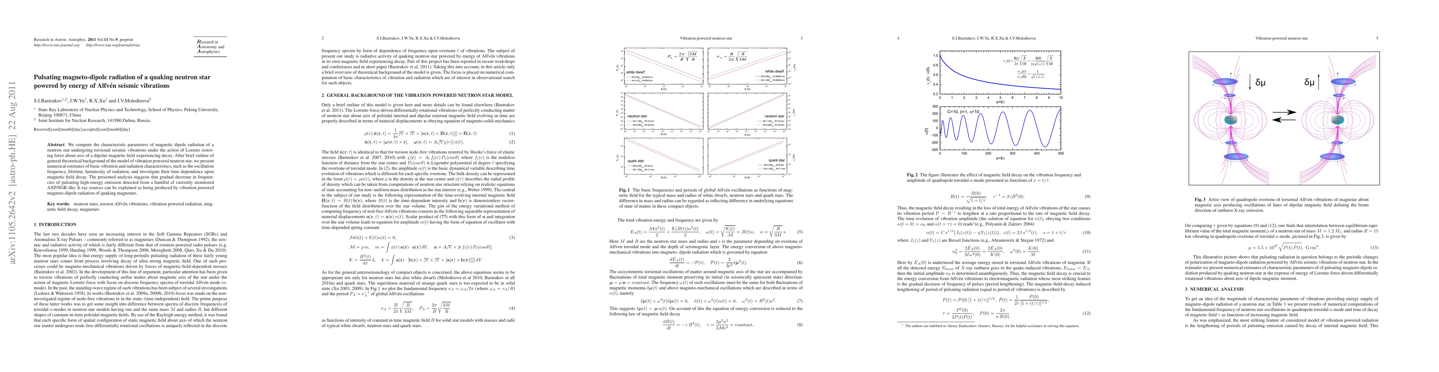 We compute the characteristic parameters of magnetic dipole radiation of a neutron star undergoing torsional seismic vibrations under the action of Lorentz restoring force about axis of a dipolar magnetic field experiencing decay. After brief outline of general theoretical background of the model of vibration powered neutron star, we present numerical estimates of basic vibration and radiation characteristics, such as the oscillation frequency, lifetime, luminosity of radiation, and investigate their time dependence upon magnetic field decay. The presented analysis suggests that gradual decrease in frequencies of pulsating high-energy emission detected from a handful of currently monitored AXP/SGR-like X-ray sources can be explained as being produced by vibration powered magneto-dipole radiation of quaking magnetars. \keywords{neutron stars, torsion Alfv\'en vibrations, vibration powered radiation, magnetic field decay, magnetars}