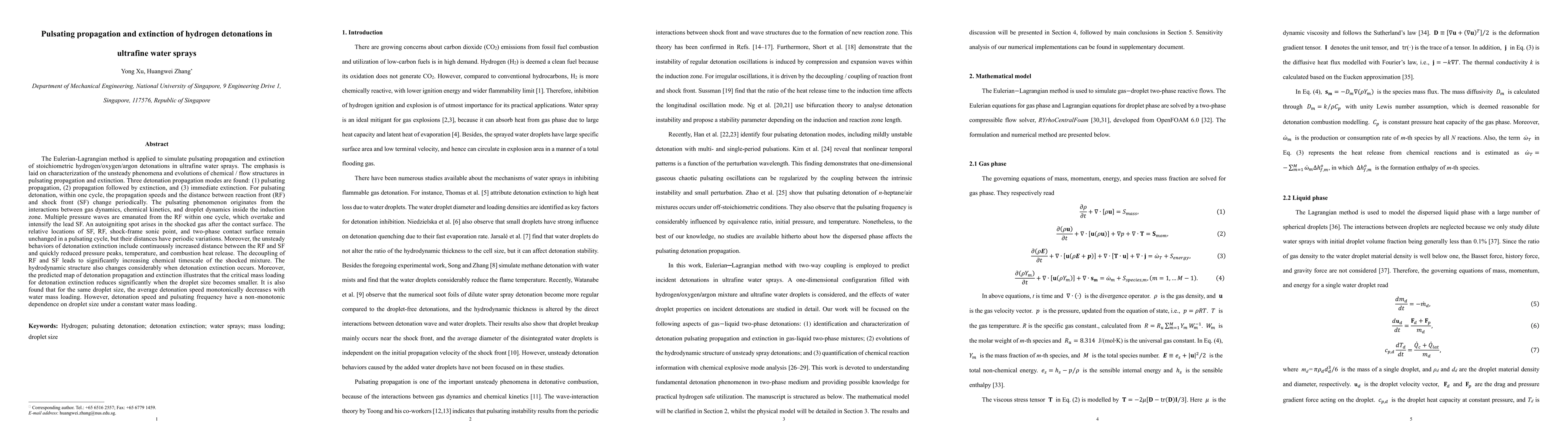 This study uses the Eulerian-Lagrangian method to simulate the complex behaviors of hydrogen detonations in ultrafine water sprays, identifying three propagation modes: pulsating, extinction-following, and immediate extinction. The pulsating detonation exhibits periodic changes in propagation speed and distance between reaction and shock fronts, driven by interactions between gas dynamics, chemical kinetics, and droplet dynamics.