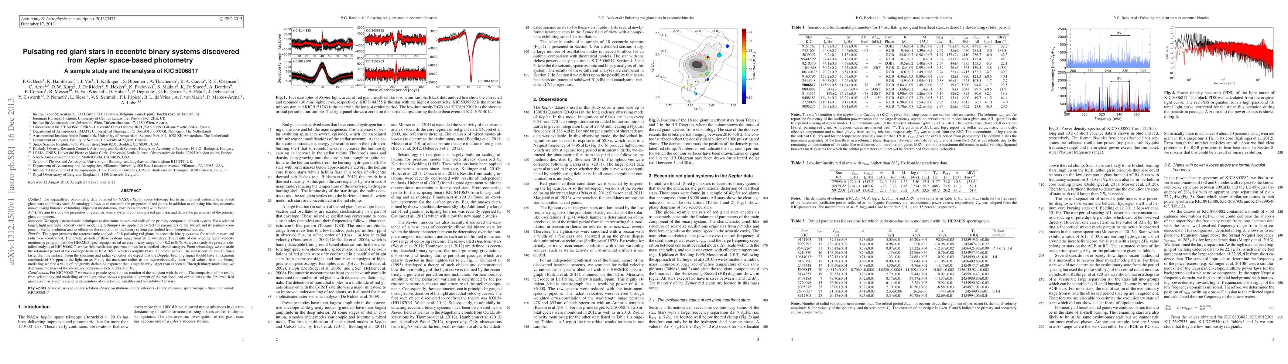This paper uses Kepler space telescope data to study 18 pulsating red giant stars in eccentric binary systems, applying asteroseismic techniques to determine the masses and radii of the primary components. A detailed analysis of KIC5006817 reveals a complex interaction between stellar rotation and orbital dynamics, suggesting these systems may evolve into cataclysmic variables or hot subdwarf B stars.