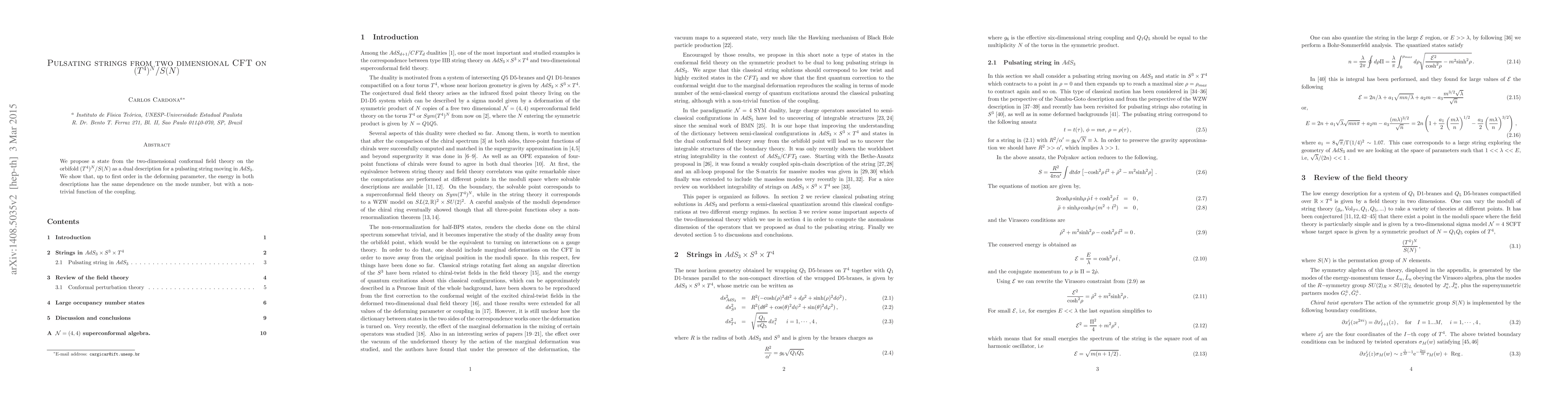 We propose a state from the two-dimensional conformal field theory on the orbifold $(T^4)^N/S(N)$ as a dual description for a pulsating string moving in $AdS_3$. We show that, up to first order in the deforming parameter, the energy in both descriptions has the same dependence on the mode number, but with a non-trivial function of the coupling.