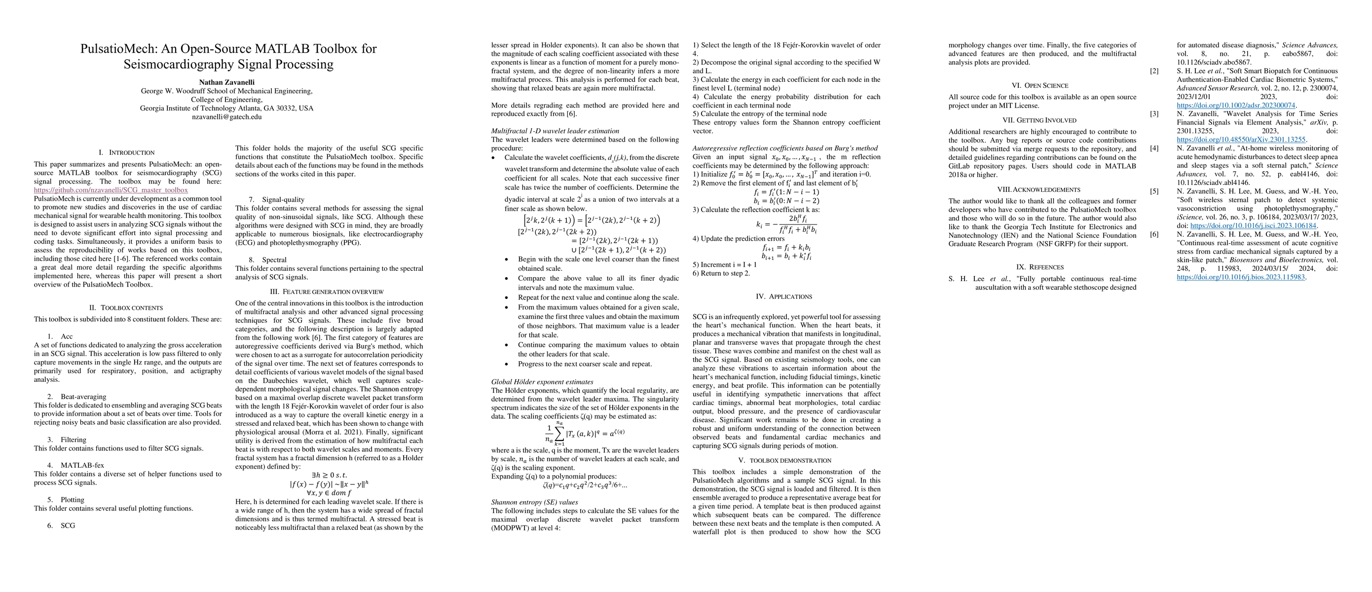 PulsatioMech is an open-source MATLAB toolbox designed for seismocardiography (SCG) signal processing, facilitating the analysis of cardiac mechanical signals for health monitoring. It aims to simplify the signal processing tasks and promote reproducibility in research using the toolbox.