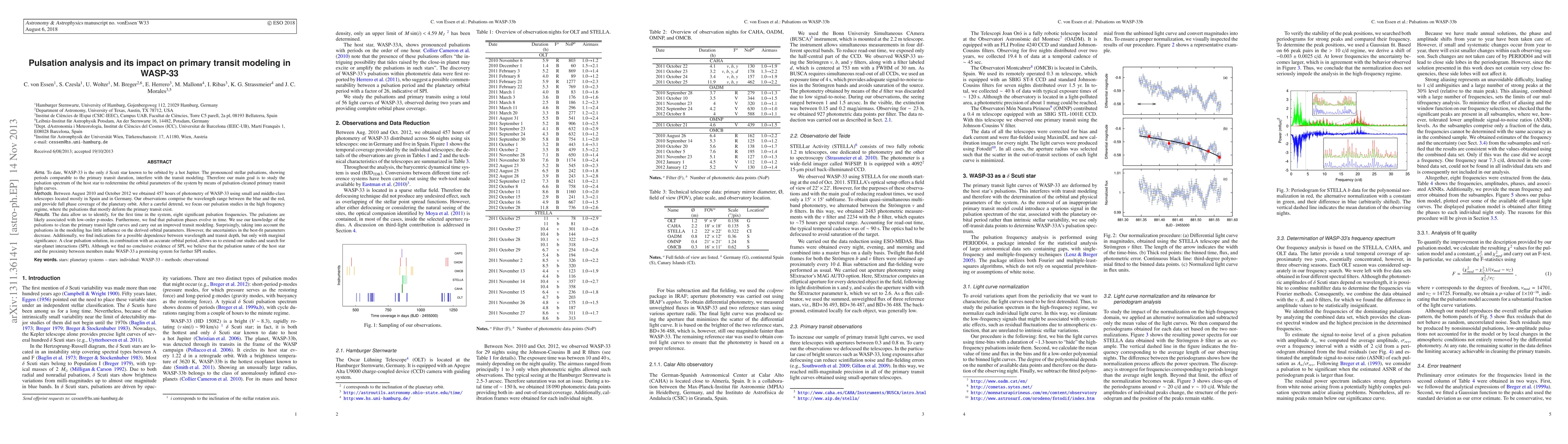To date, WASP-33 is the only delta Scuti star known to be orbited by a hot Jupiter. The pronounced stellar pulsations, showing periods comparable to the primary transit duration, interfere with the transit modeling. Therefore our main goal is to study the pulsation spectrum of the host star to redetermine the orbital parameters of the system by means of pulsation-cleaned primary transit light curves. Between August 2010 and October 2012 we obtained 457 hours of photometry of WASP-33 using small and middle-class telescopes located mostly in Spain and in Germany. Our observations comprise the wavelength range between the blue and the red, and provide full phase coverage of the planetary orbit. After a careful detrend, we focus our pulsation studies in the high frequency regime, where the pulsations that mostly deform the primary transit exist. The data allow us to identify, for the first time in the system, eight significant pulsation frequencies. The pulsations are likely associated with low-order p-modes. Furthermore, we find that pulsation phases evolve in time. We use our knowledge of the pulsations to clean the primary transit light curves and carry out an improved transit modeling. Surprisingly, taking into account the pulsations in the modeling has little influence on the derived orbital parameters. However, the uncertainties in the best-fit parameters decrease. Additionally, we find indications for a possible dependence between wavelength and transit depth, but only with marginal significance. A clear pulsation solution, in combination with an accurate orbital period, allows us to extend our studies and search for star-planet interactions (SPI). Although we find no conclusive evidence of SPI, we believe that the pulsation nature of the host star and the proximity between members make WASP-33 a promising system for further SPI studies.