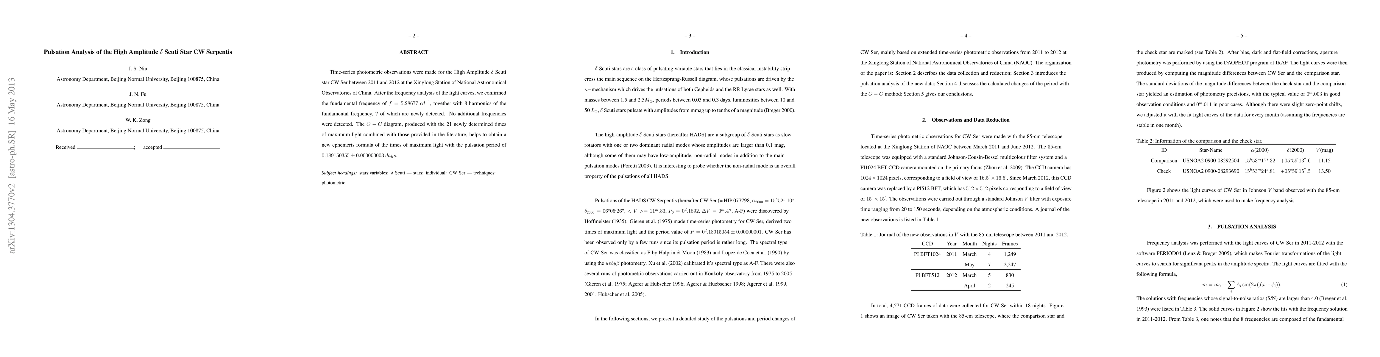Time-series photometric observations were made for the High Amplitude $\delta$ Scuti star CW Ser between 2011 and 2012 at the Xinglong Station of National Astronomical Observatories of China. After the frequency analysis of the light curves, we confirmed the fundamental frequency of $f = 5.28677\ cd^{-1}$, together with 8 harmonics of the fundamental frequency, 7 of which are newly detected. No additional frequencies were detected. The O-C diagram, produced with the 21 newly determined times of maximum light combined with those provided in the literature, helps to obtain a new ephemeris formula of the times of maximum light with the pulsation period of $0.189150355 \pm 0.000000003\ days$.