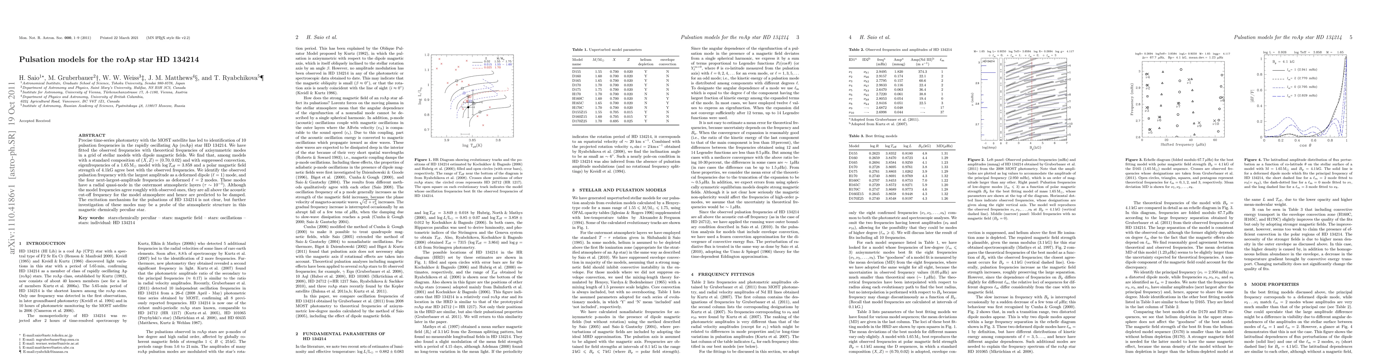 Precise time-series photometry with the MOST satellite has led to identification of 10 pulsation frequencies in the rapidly oscillating Ap (roAp) star HD 134214. We have fitted the observed frequencies with theoretical frequencies of axisymmetric modes in a grid of stellar models with dipole magnetic fields. We find that, among models with a standard composition of $(X,Z) = (0.70,0.02)$ and with suppressed convection, eigenfrequencies of a $1.65\,{\rm M}_\odot$ model with $\log T_{\rm eff} = 3.858$ and a polar magnetic field strength of 4.1kG agree best with the observed frequencies. We identify the observed pulsation frequency with the largest amplitude as a deformed dipole ($\ell = 1$) mode, and the four next-largest-amplitude frequencies as deformed $\ell = 2$ modes. These modes have a radial quasi-node in the outermost atmospheric layers ($\tau \sim 10^{-3}$). Although the model frequencies agree roughly with observed ones, they are all above the acoustic cut-off frequency for the model atmosphere and hence are predicted to be damped. The excitation mechanism for the pulsations of HD 134214 is not clear, but further investigation of these modes may be a probe of the atmospheric structure in this magnetic chemically peculiar star.