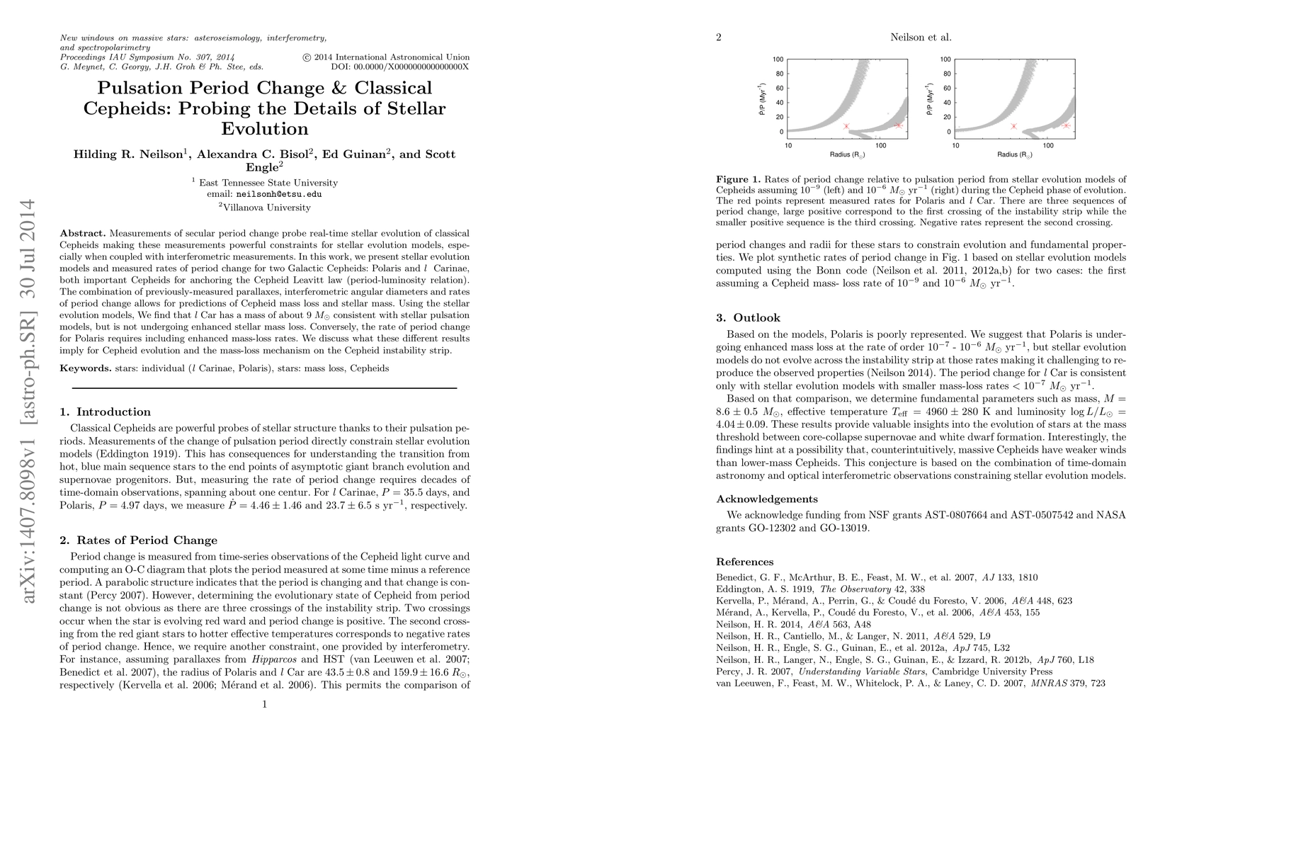 Measurements of secular period change probe real-time stellar evolution of classical Cepheids making these measurements powerful constraints for stellar evolution models, especially when coupled with interferometric measurements. In this work, we present stellar evolution models and measured rates of period change for two Galactic Cepheids: Polaris and l Carinae, both important Cepheids for anchoring the Cepheid Leavitt law (period-luminosity relation). The combination of previously-measured parallaxes, interferometric angular diameters and rates of period change allows for predictions of Cepheid mass loss and stellar mass. Using the stellar evolution models, We find that l Car has a mass of about 9 $M_\odot$ consistent with stellar pulsation models, but is not undergoing enhanced stellar mass loss. Conversely, the rate of period change for Polaris requires including enhanced mass-loss rates. We discuss what these different results imply for Cepheid evolution and the mass-loss mechanism on the Cepheid instability strip.