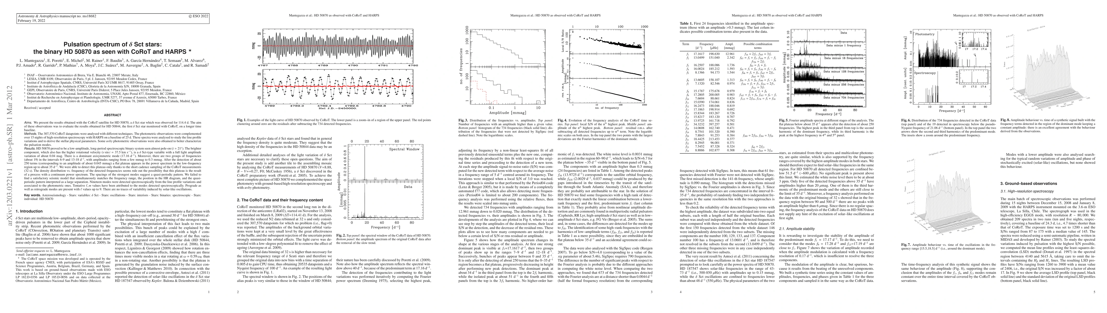 We present the results obtained with the CoRoT satellite for HD 50870, a Delta Sct star which was observed for 114.4 d. The 307,570 CoRoT datapoints were analysed with different techniques. The photometric observations were complemented over 15 nights of high-resolution spectroscopy with HARPS on a baseline of 25 d. Some uvby photometric observations were also obtained to better characterize the pulsation modes. HD 50870 proved to be a low-amplitude, long-period spectroscopic binary system seen almost pole-on (i~21 deg. The brighter component, which also has the higher rotational velocity (v sin i=37.5 km/s), is a delta Sct-type variable. There is a dominant axisymmetric mode (17.16 c/d). After the detection of about 250 terms (corresponding to an amplitude of about 0.045 mmag) a flat plateau appears in the power spectrum in the low-frequency region up to about 35 c/d. We were able to detect this plateau only thanks to the short cadence sampling of the CoRoT measurements (32 s). The density distribution vs. frequency of the detected frequencies seems rule out the possibility that this plateau is the result of a process with a continuum power spectrum. The spacings of the strongest modes suggest a quasi-periodic pattern. We failed to find a satisfactory seismic model that simultaneously matches the frequency range, the position in the HR diagram, and the quasi-periodic pattern interpreted as a large separation. Nineteen modes were detected spectroscopically from the line profile variations and associated to the photometric ones. Tentative l,m values have been attributed to the modes detected spectroscopically. Prograde as well as retrograde modes are present with l degree values up to 9. There are no traces of variability induced by solar-like oscillations.
